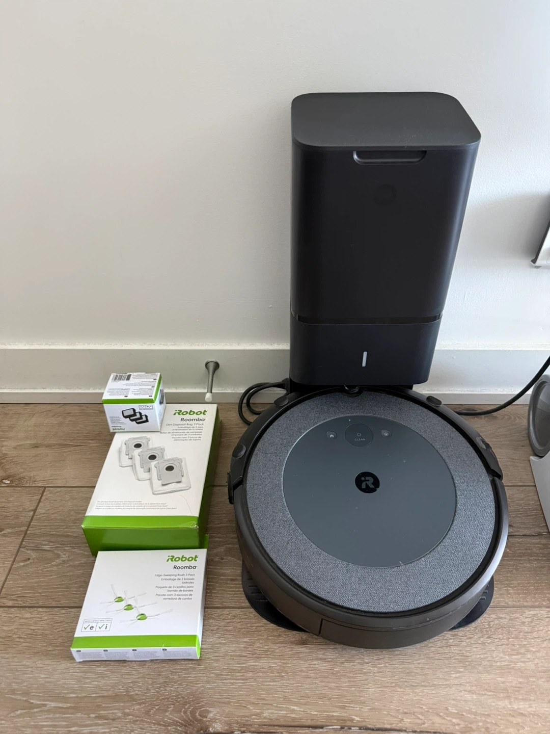 This iRobot Roomba i3+ is a robot vacuum with a self-emptying Clean Base. It comes with 3 dirt disposal bags and 3 edge-sweeping brushes. It's great for keeping your floors clean with minimal effort!