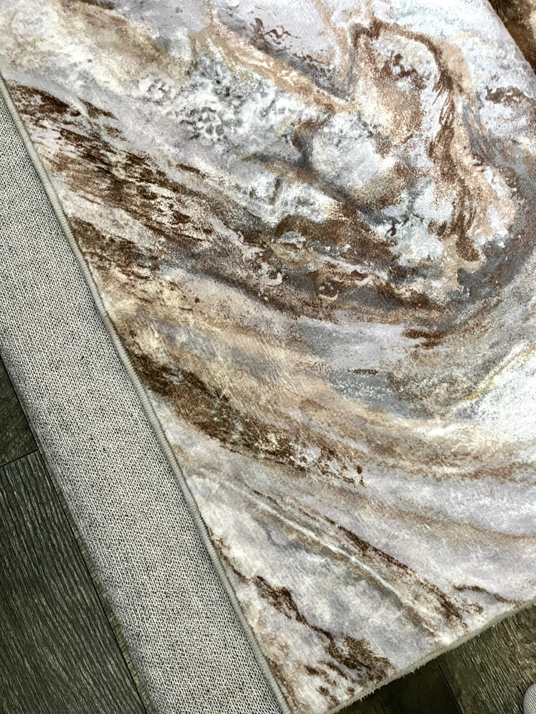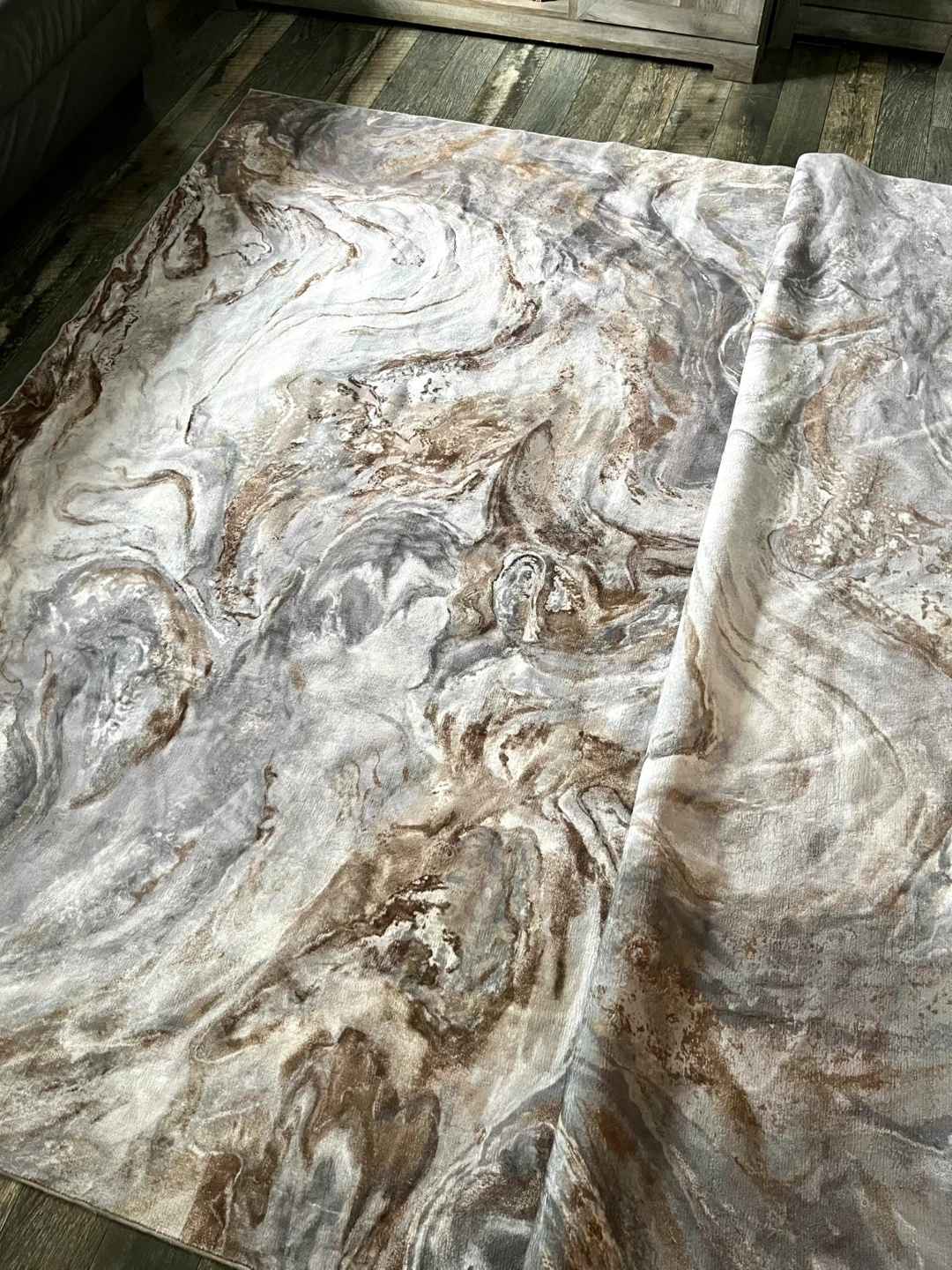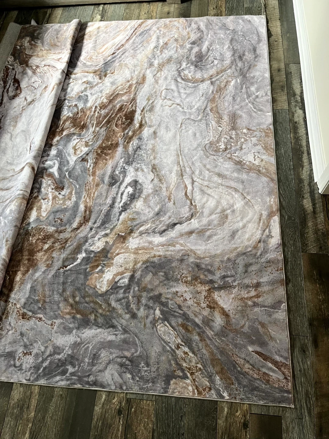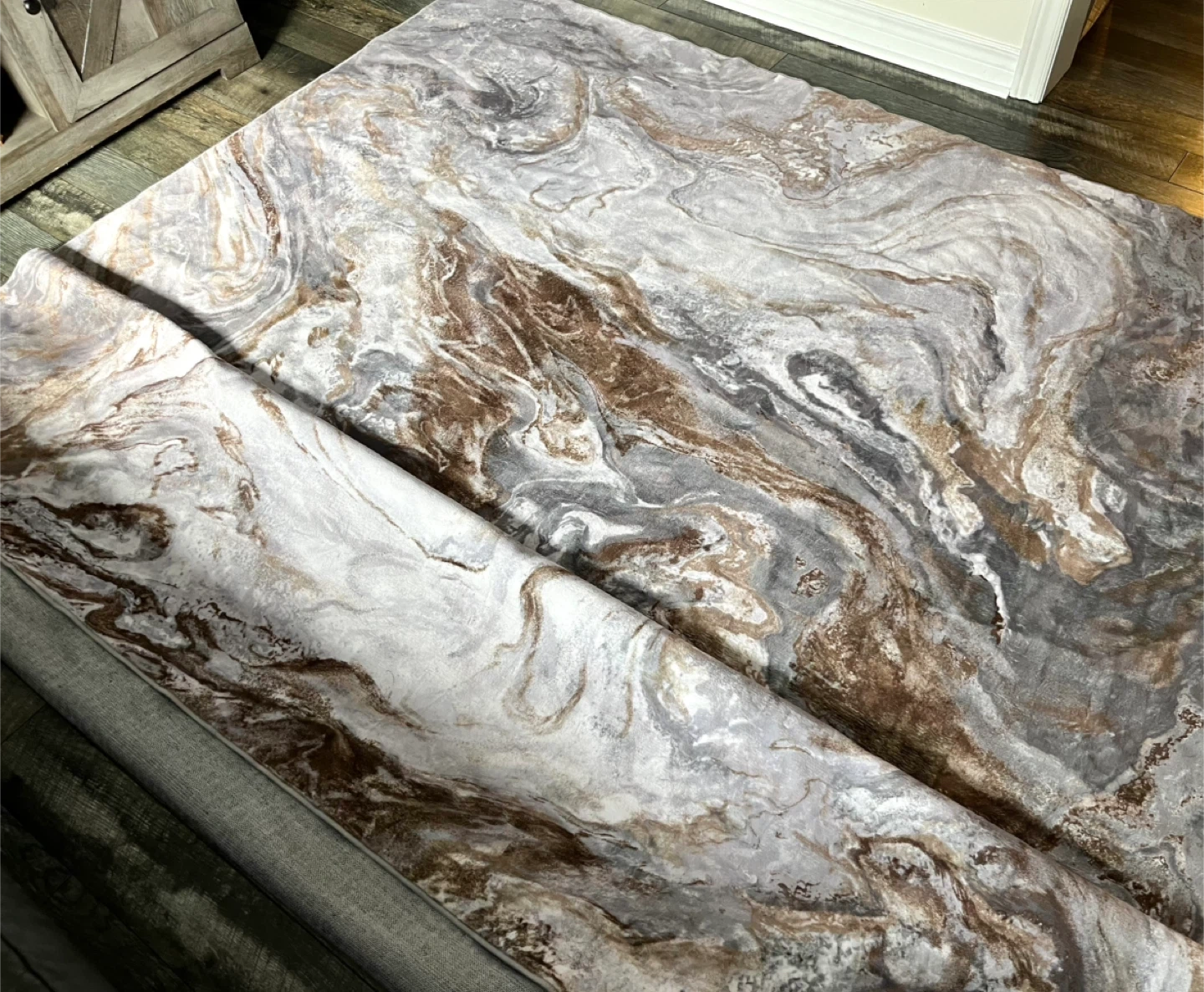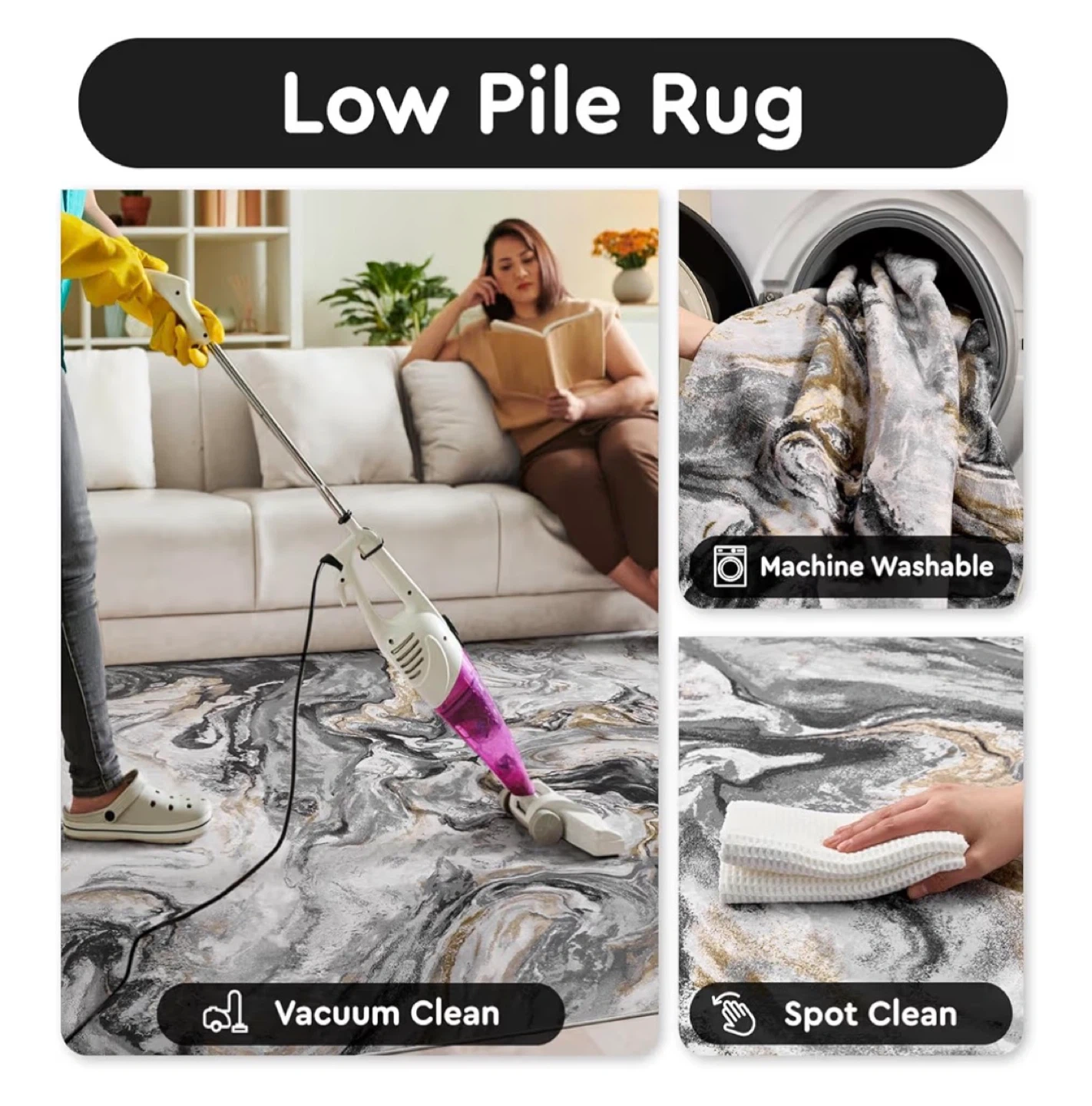 This 8x10 area rug features an abstract design in grey, black, and gold tones. It's machine washable and non-slip, making it great for busy households. The low pile is stain-resistant and pet & kids friendly!