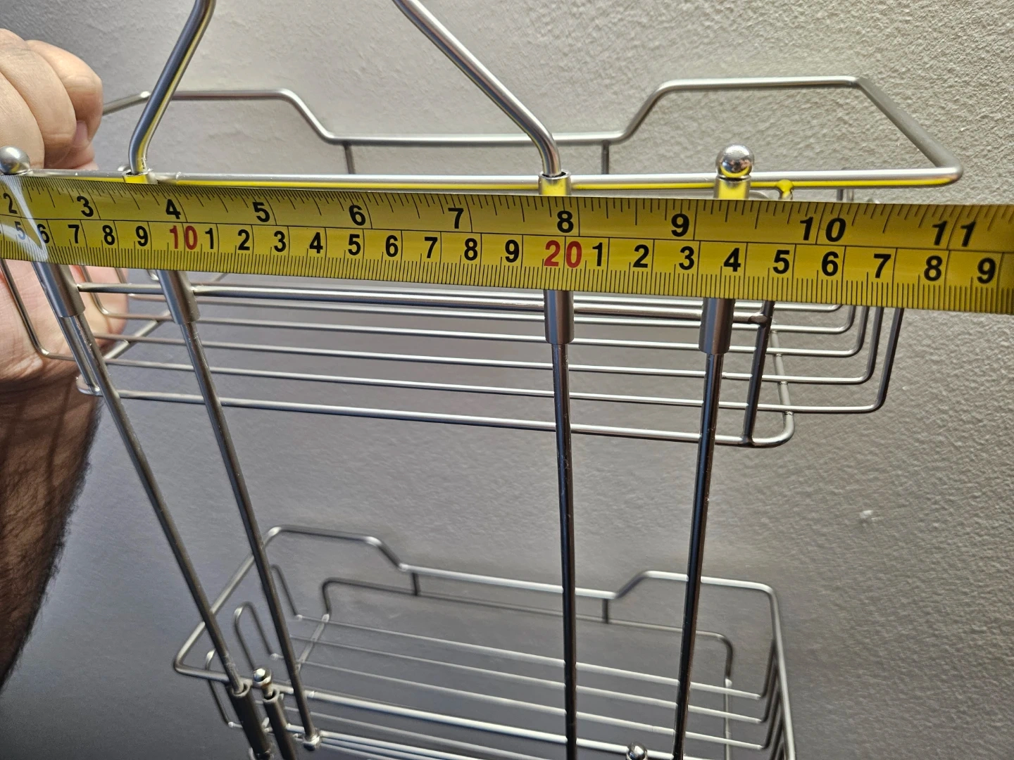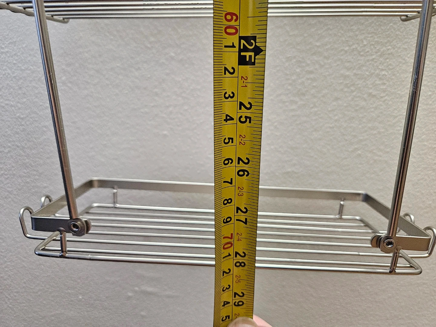 This is a 3-tier hanging shower caddy with a stainless steel construction. It's approximately 28 inches long. Includes mounting hardware. Great for organizing your bathroom essentials!