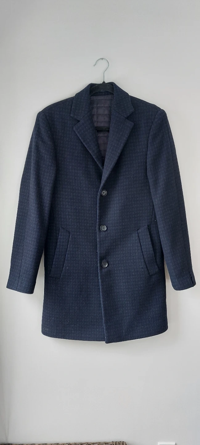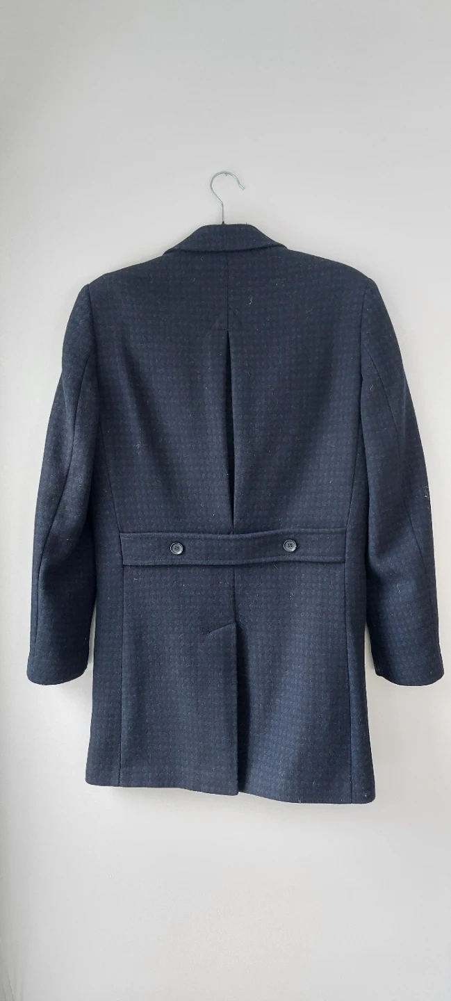 A classic navy blue coat, perfect for cooler weather! The coat features a button-up front and a tailored fit. It's in great condition and ready for a new owner! Size: S/M
