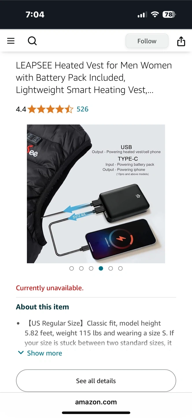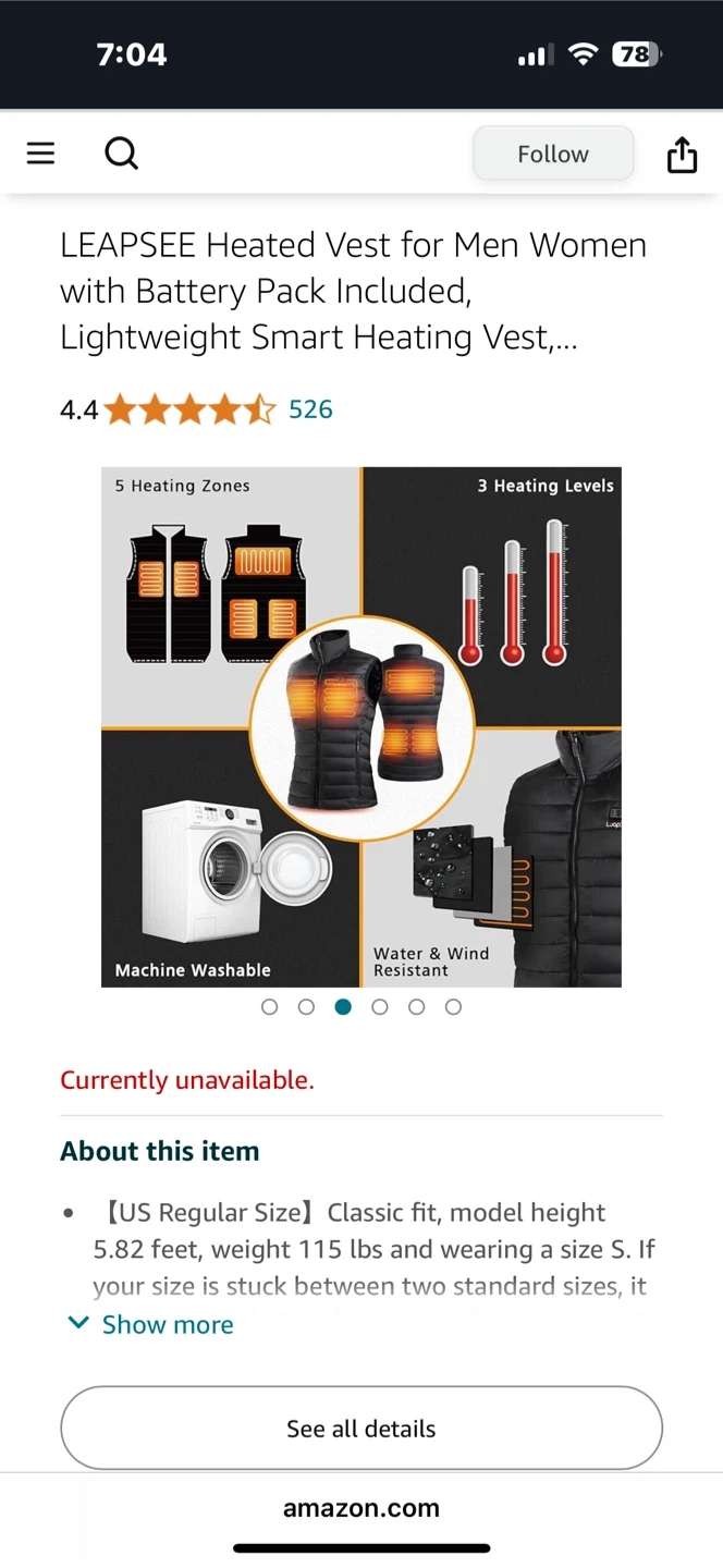 This LEAPSEE heated vest is designed for warmth and comfort. It features 5 heating zones and 3 adjustable temperature levels, with a battery pack offering up to 10 hours of heating time. The vest is water & wind resistant and machine washable. It's suitable for colder weather and functional everyday wear.