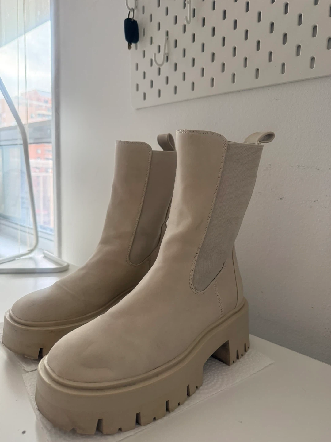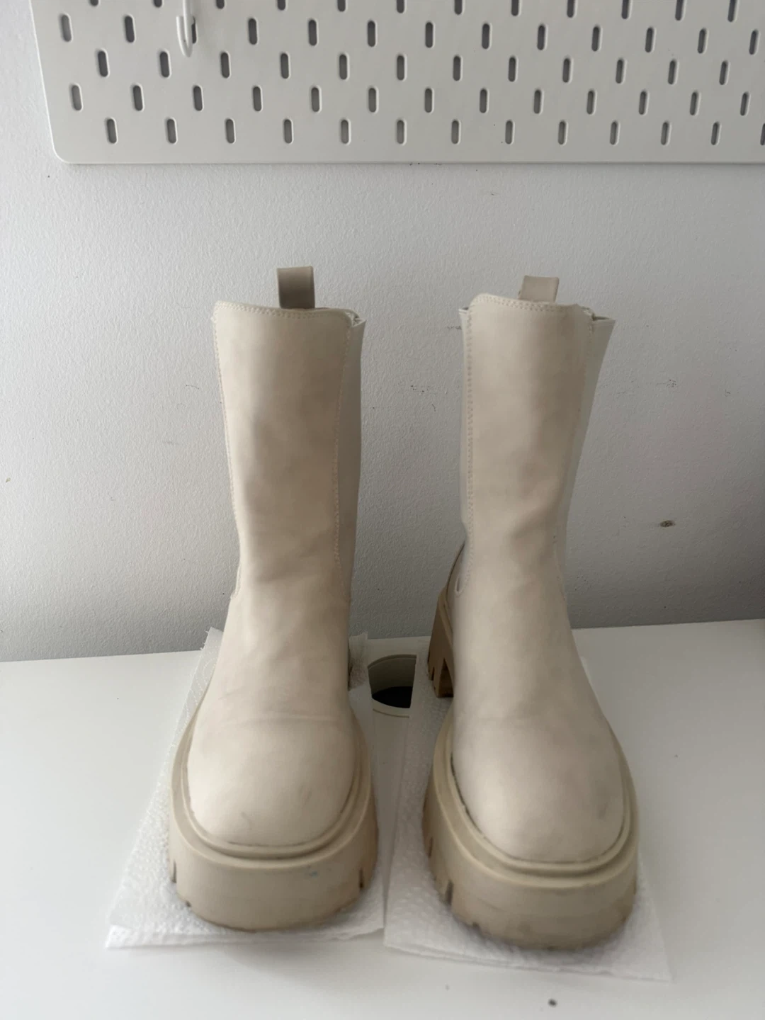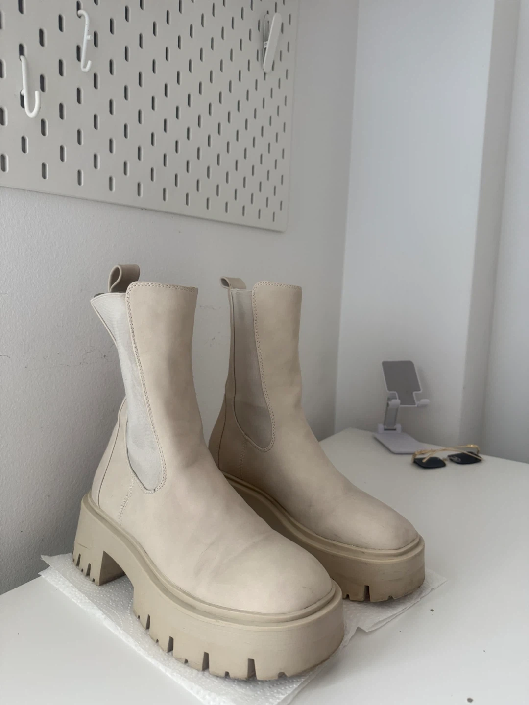 Cream coloured platform chelsea boots. Has a faux leather upper with elastic side panels. Chunky lug sole for extra grip, good for snowy weather. Bought it from Call It Spring. Open for negotiation