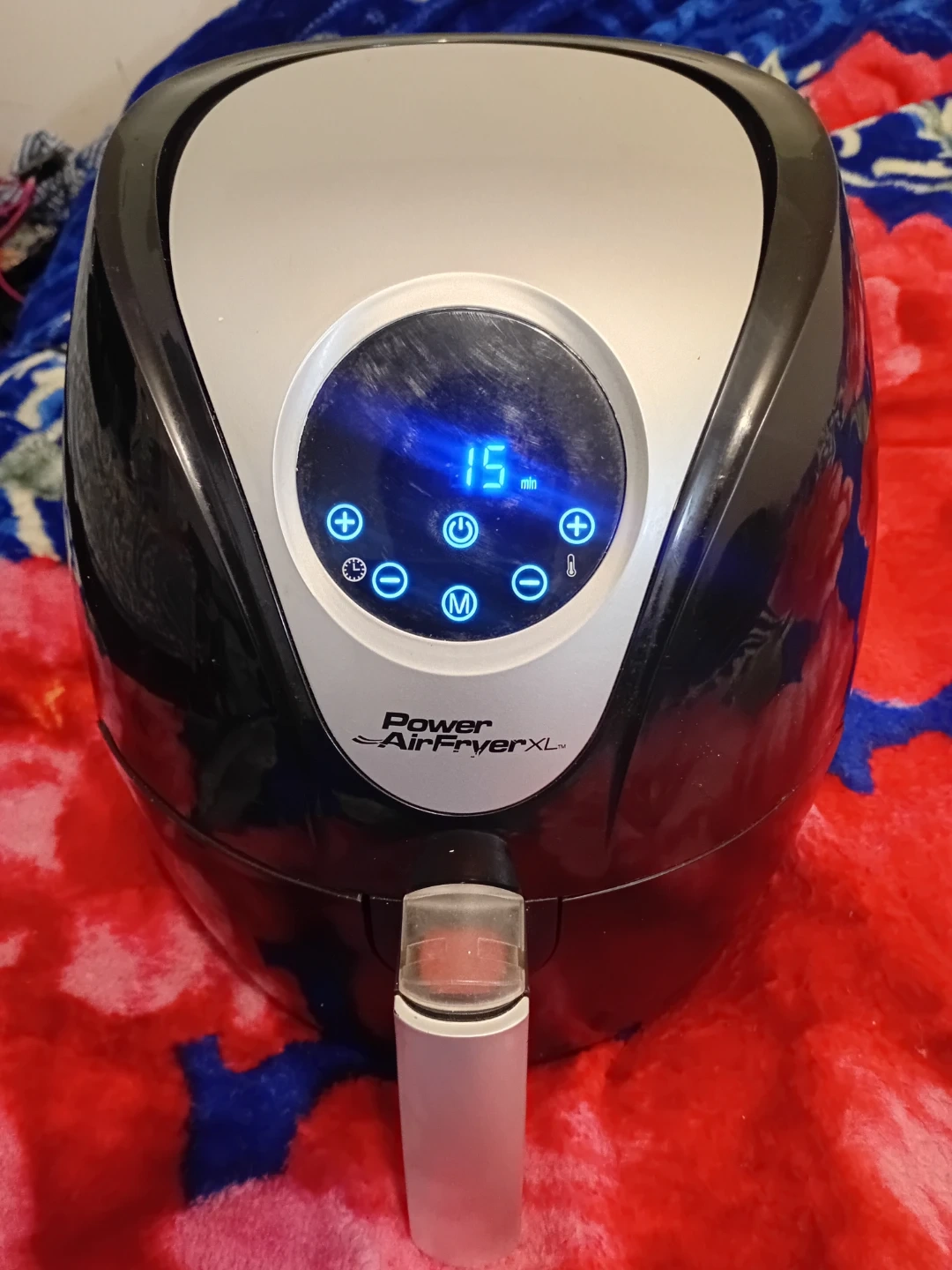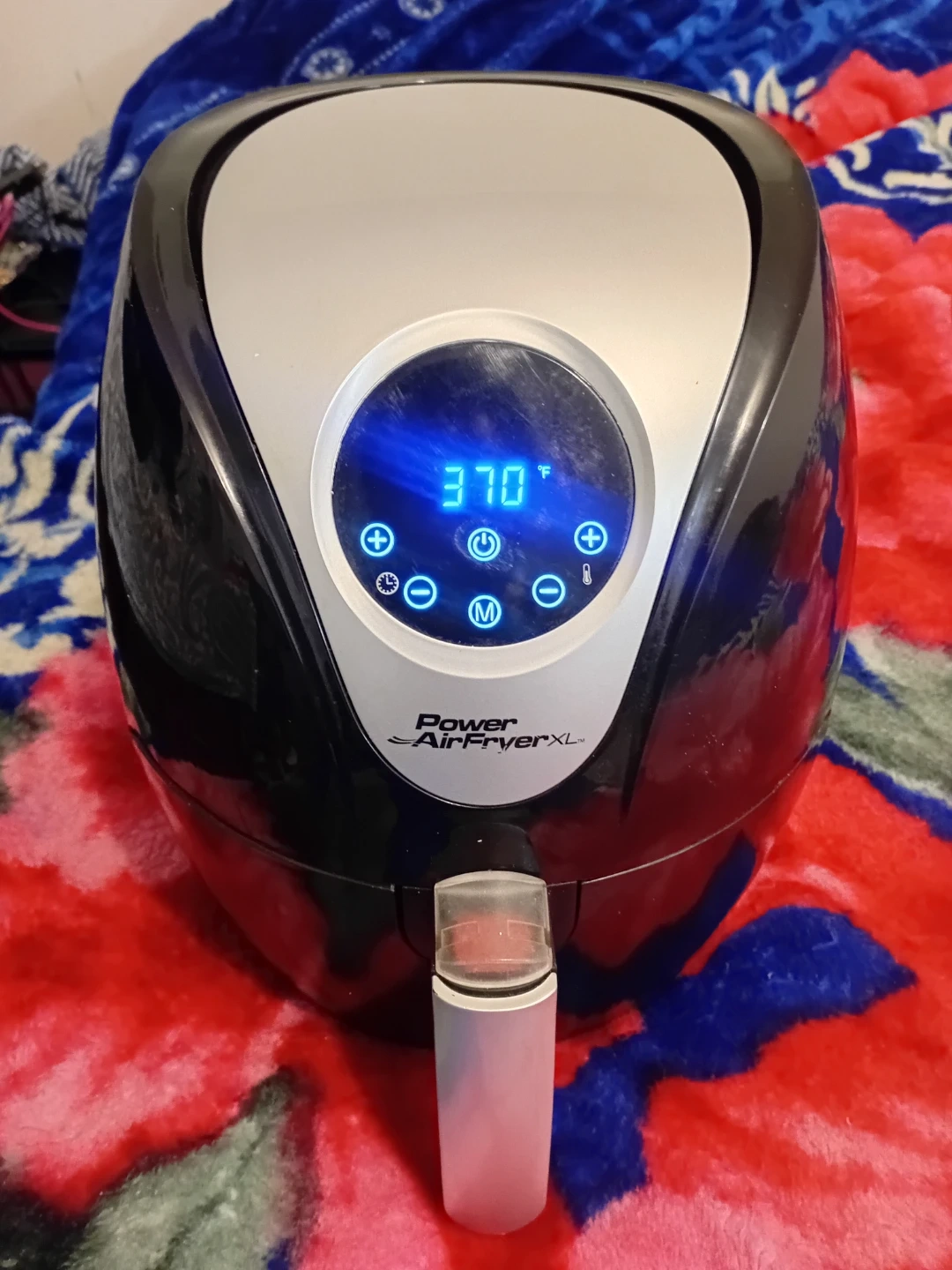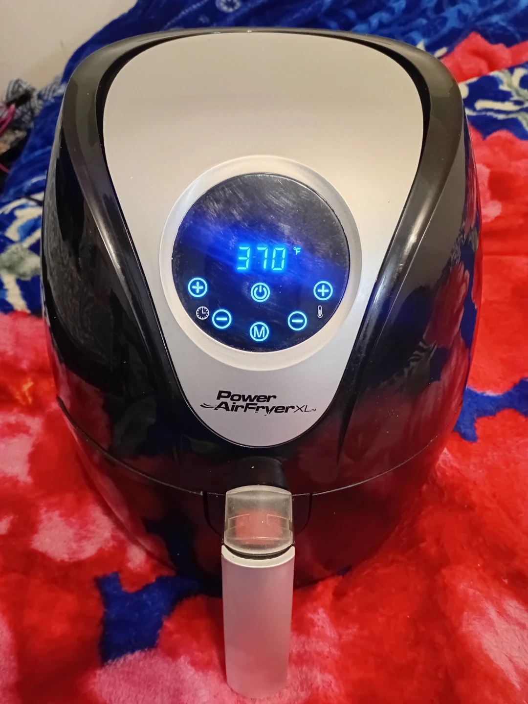 Power AirFryer XL appliance. It's black and silver with a digital display. This air fryer is great for cooking all sorts of foods quickly and efficiently. It has a timer and temperature controls.