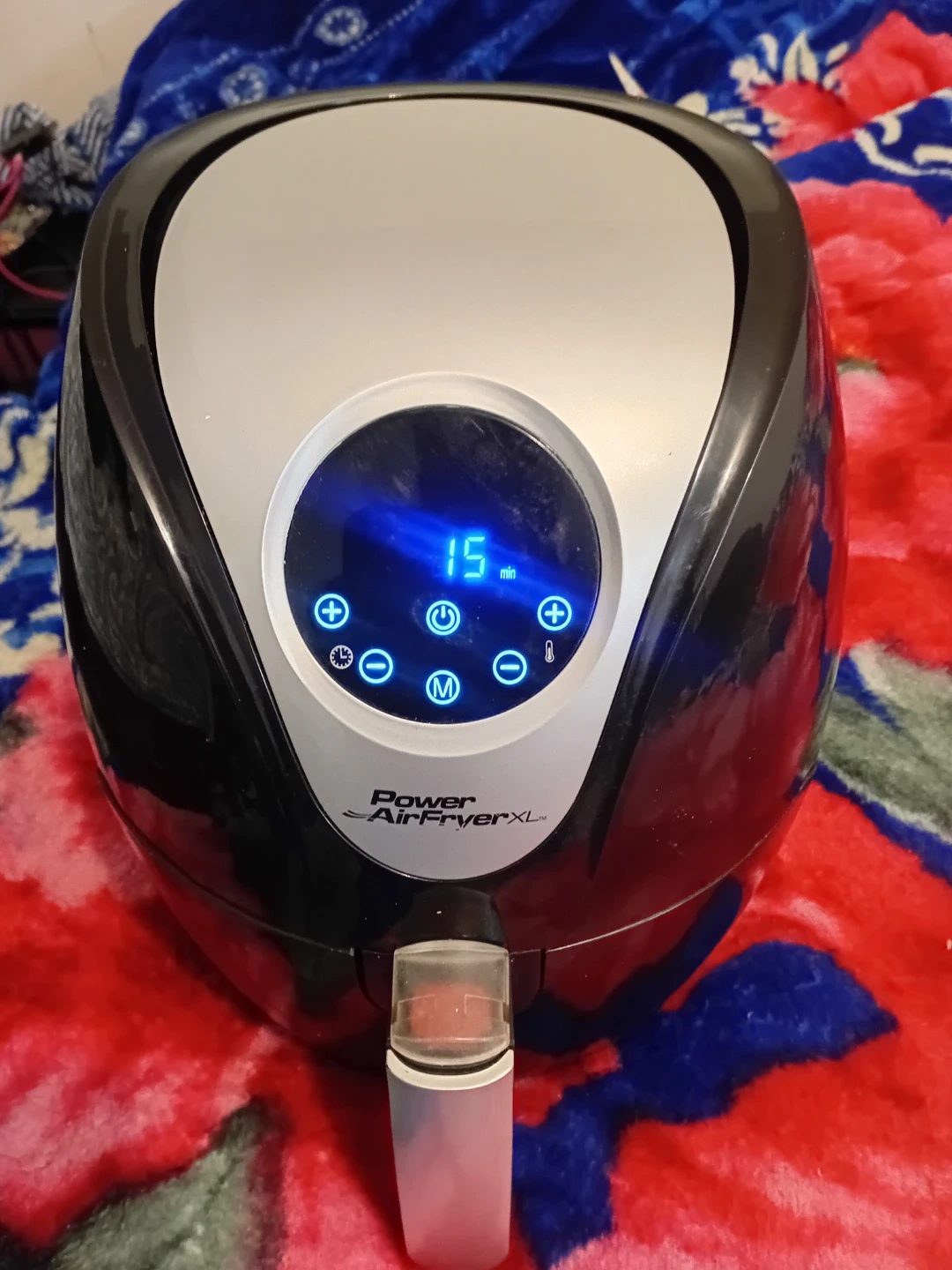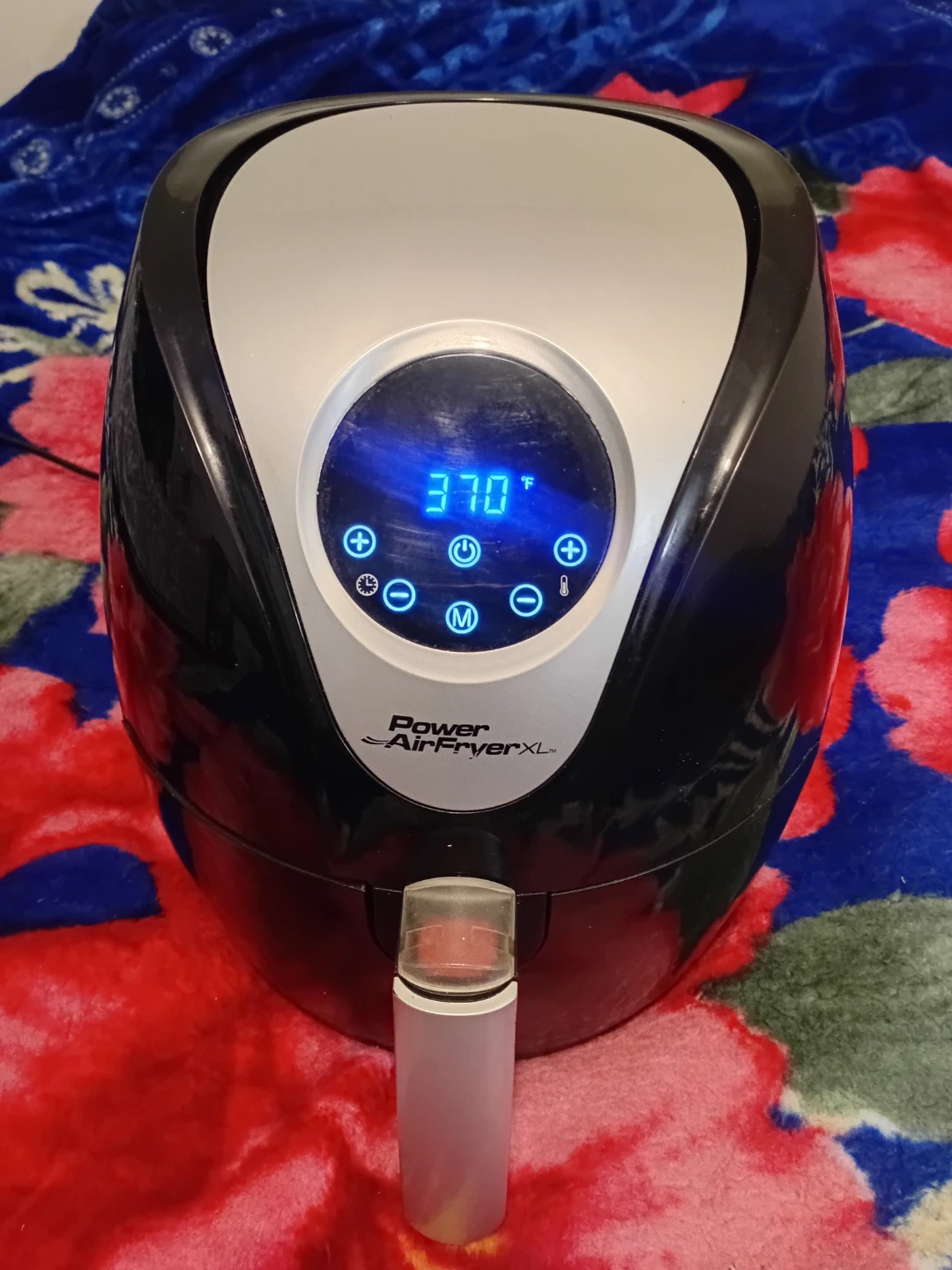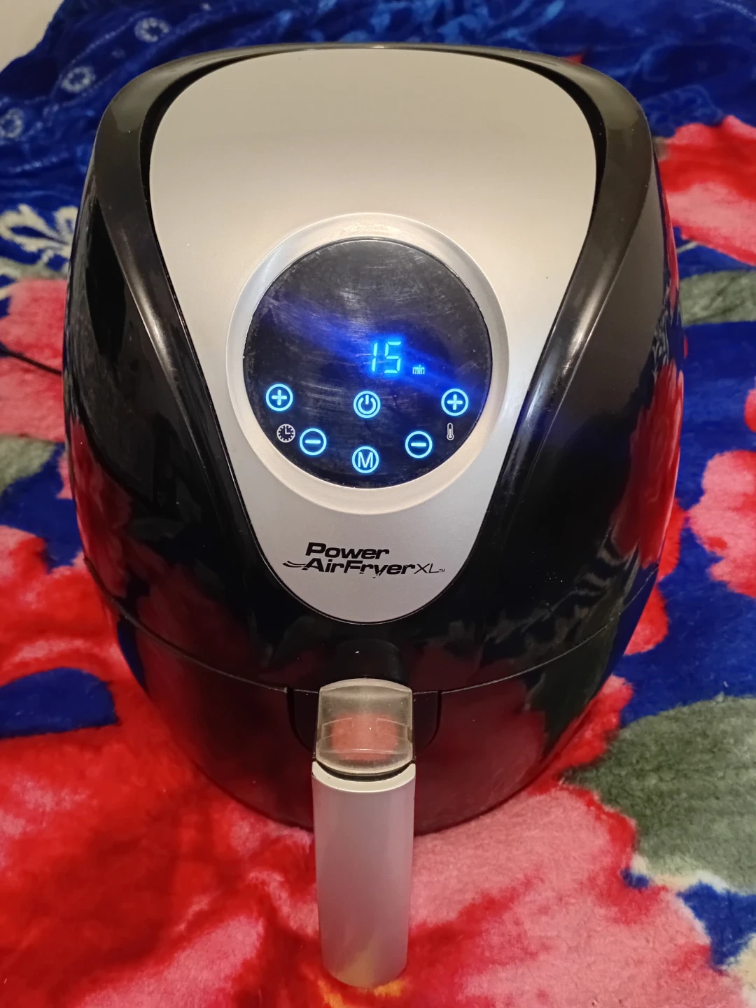 Power AirFryer XL appliance. It's black and silver with a digital display. This air fryer is great for cooking all sorts of foods quickly and efficiently. It has a timer and temperature controls.