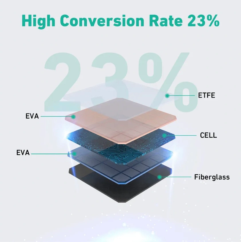 Reliable and clean energy. Supports up to 100W output power via 19.5V DC, USB-PD (45W), Quick Charge 3.0 (19.5W) and normal USB charging (12W). Powers laptops, smartphones, electric blankets, drink coolers and more. High Efficiency: Offers high conversion efficiency of up to 23%, producing more energy from available sunlight. For Outdoor Adventures: Ideal for hiking, camping, RV trips, fishing, boating and more. Lightweight, water and dirt resistant, easy to set up and maintain. Safe, convenient and easy to use: Simply place the solar panel in the direction of the sun, even from your vehicle or a tree, and adjust the angle with the stand.