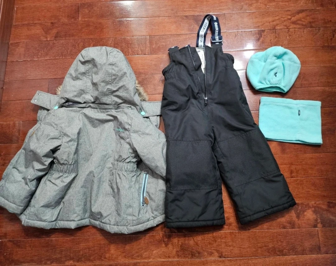 Here's a super cute OshKosh B'gosh snowsuit set! It includes a jacket, snow pants with suspenders, a hat, and a neck warmer. Perfect for keeping your little one warm and cozy this winter season