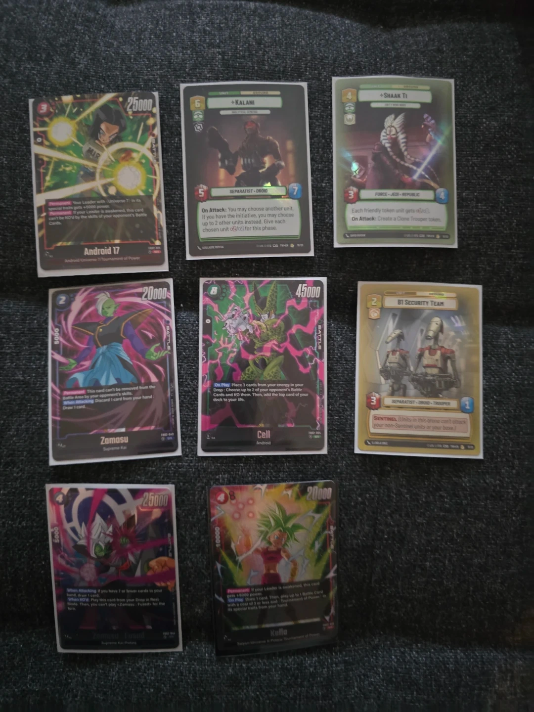 This is a lot of Dragon Ball Super trading cards. It includes cards like Android 17, Zamasu, Cell, and Kefla. There are also Star Wars cards like Kalani, Shaak Ti, and B1 Security Team.