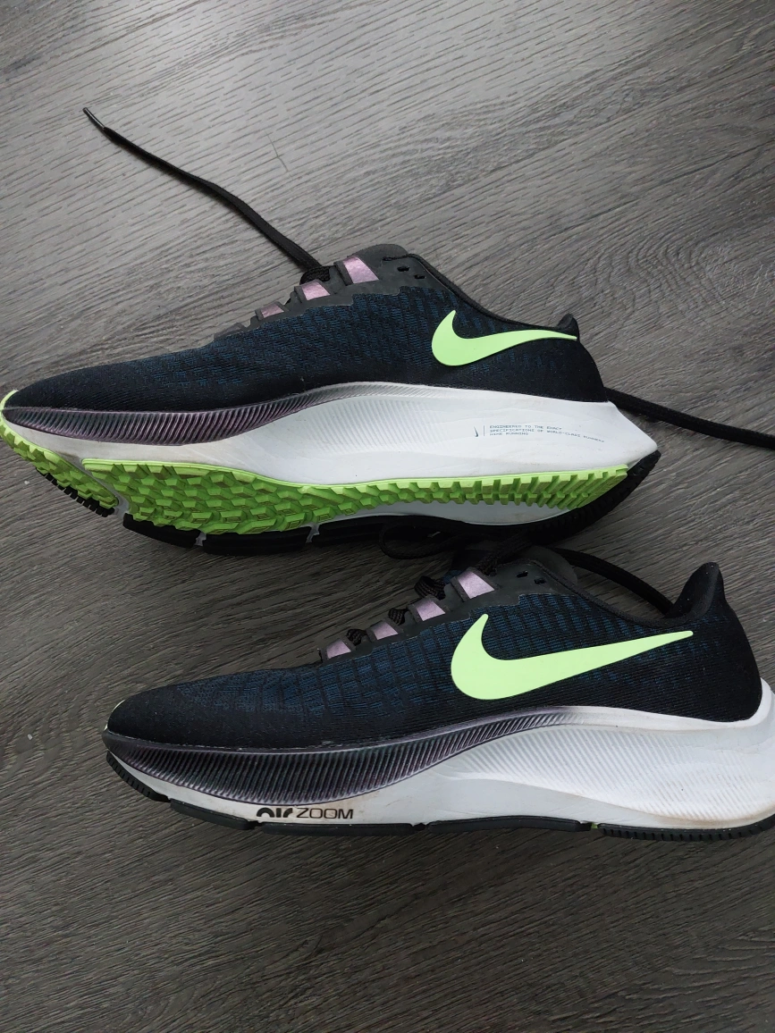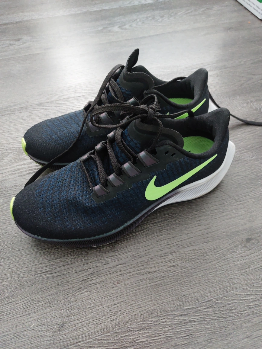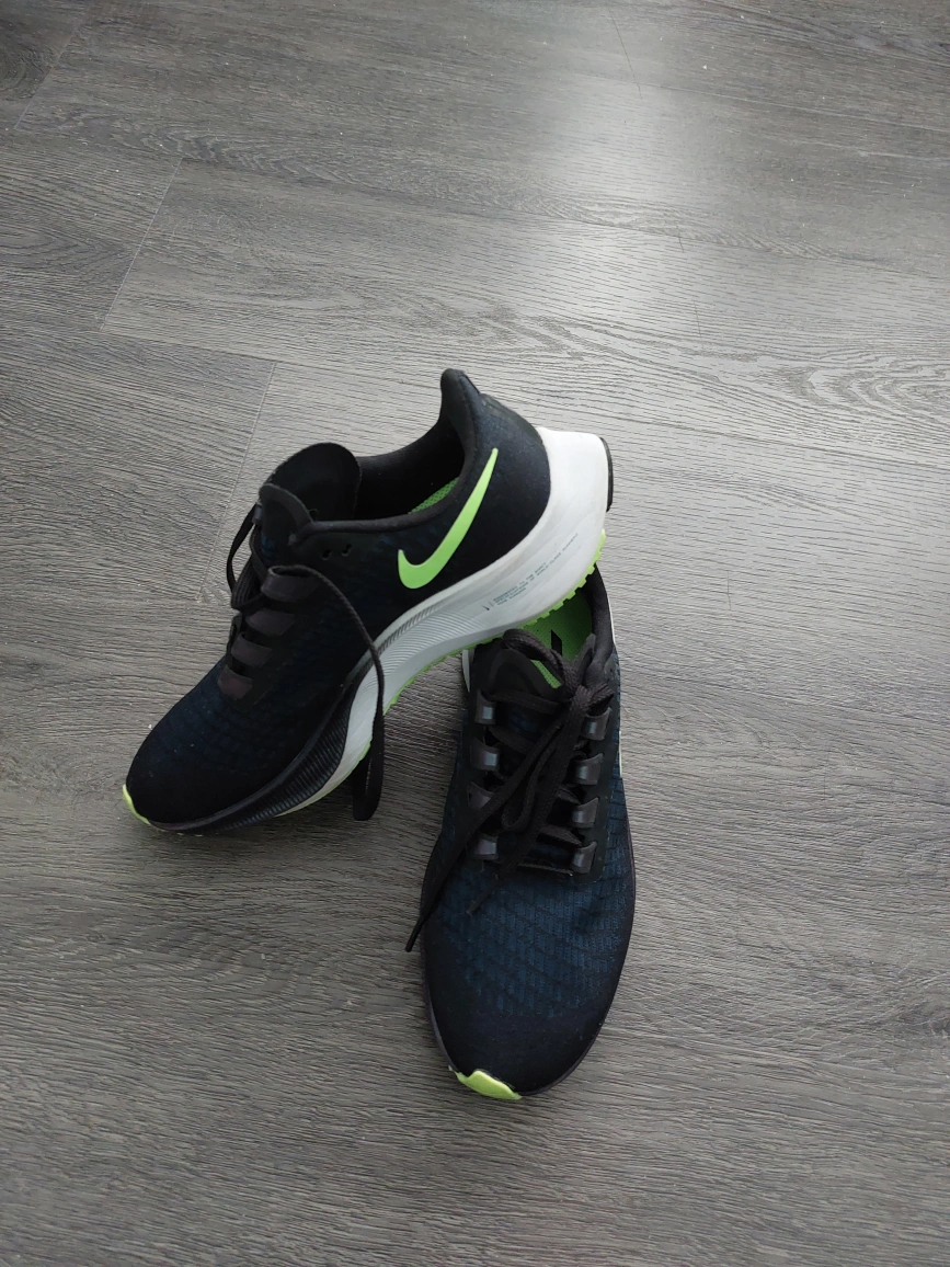 Black and neon green Nike Air Zoom Pegasus 37 running shoes. Women's US size 6, EU size 36.5, UK size 3.5. These shoes are designed for performance running.