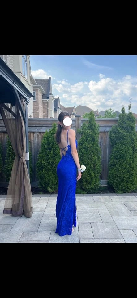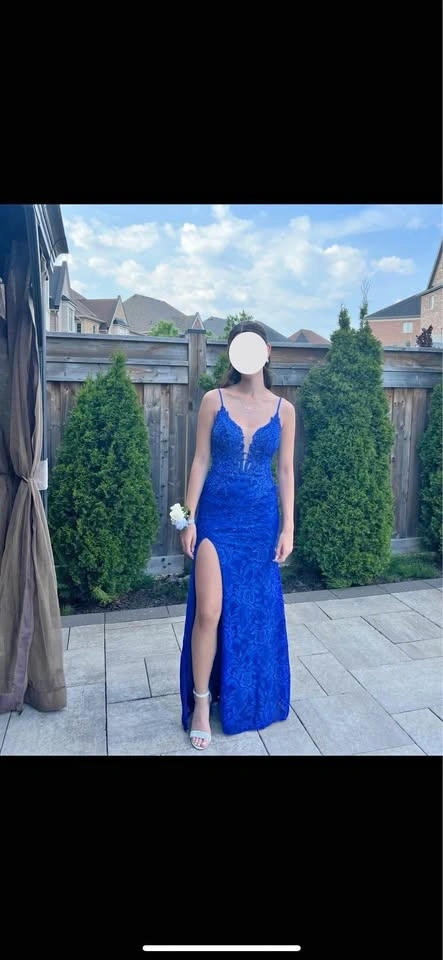 Worn only once. This stunning Royal Blue Clarisse "810451" gown is a beautiful expression of elegance. It features delicate spaghetti straps, a graceful V-neckline with an illusion inset, and intricate leaf motif lace adorned with shimmering jewelled accents. The sleek sheath silhouette has a stylish slit for ease of movement. The back detail is thoughtfully crafted, and the sweep train provides a captivating finish. Perfect for formal events, evening galas, and special occasions. Details include: Heat Stones, Stylish Slit, Elegant Back Detail, Spaghetti Straps, Illusion Inset, Sweep Train. Size 2. Located in Richmond Hill.