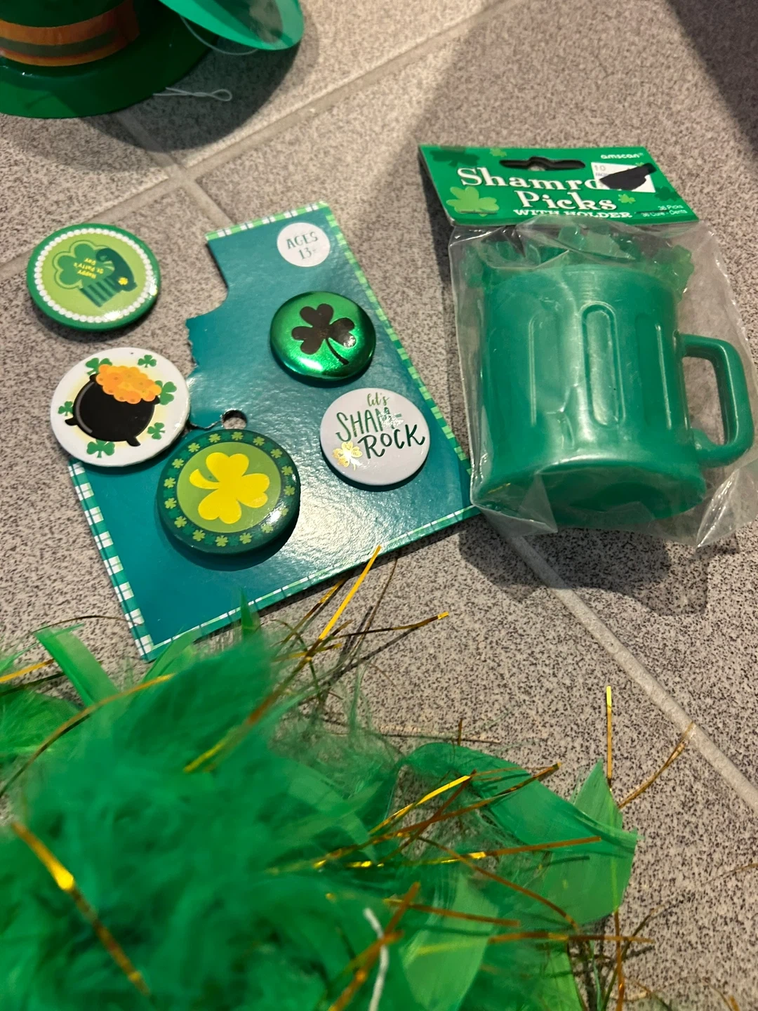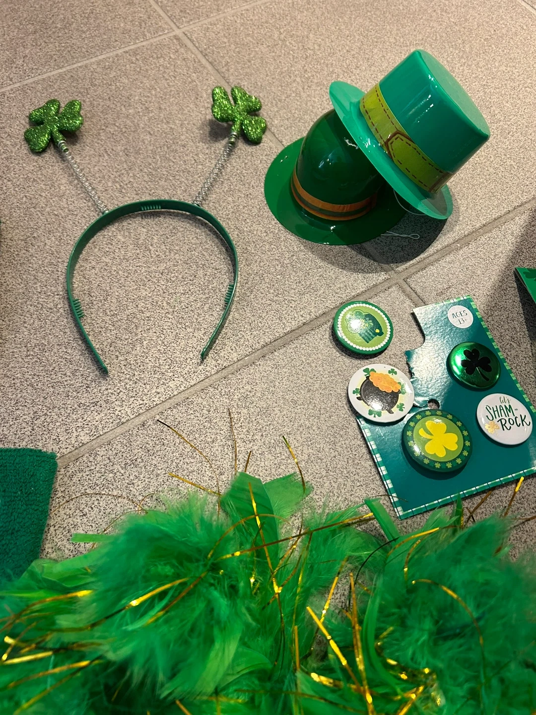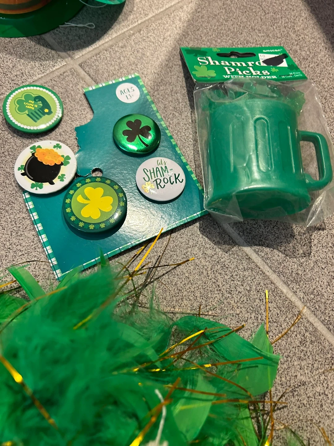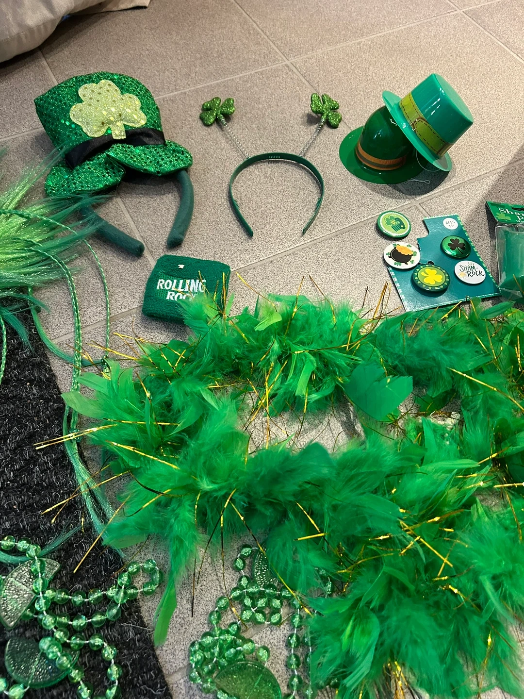 This lot includes various St. Patrick's Day themed party accessories. Items feature shamrocks, pots of gold, and green colors. Includes hats, headbands, buttons, beads, and decorative picks. Little hats for dogs .Great for festive celebrations!