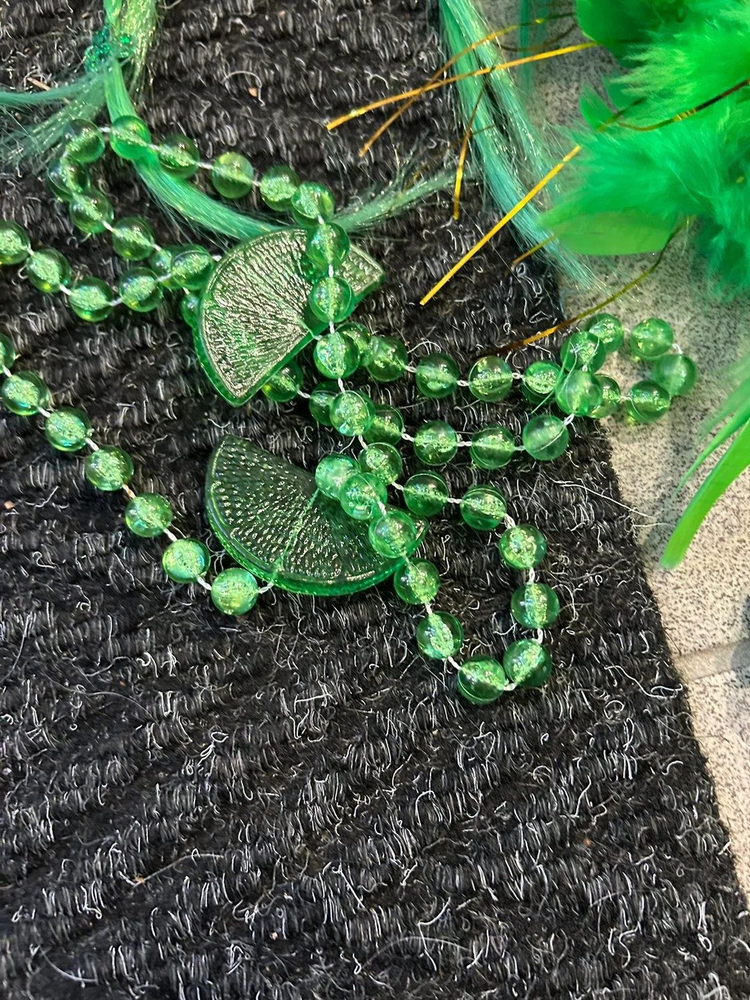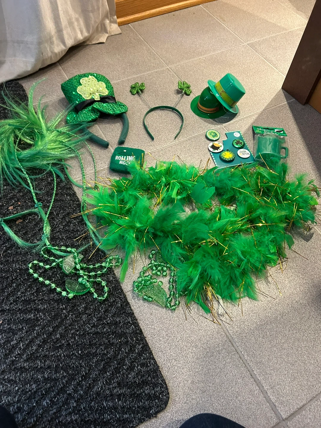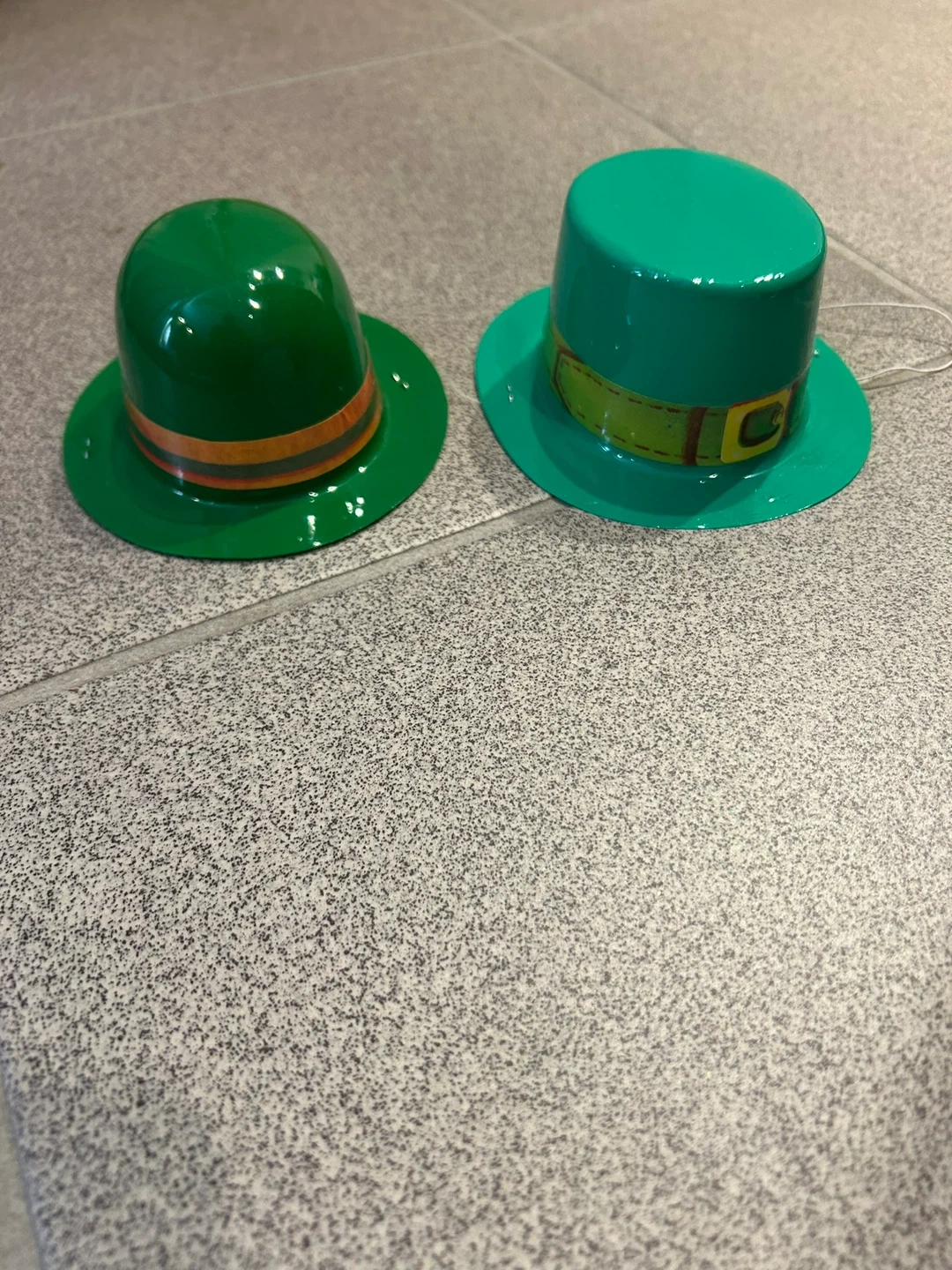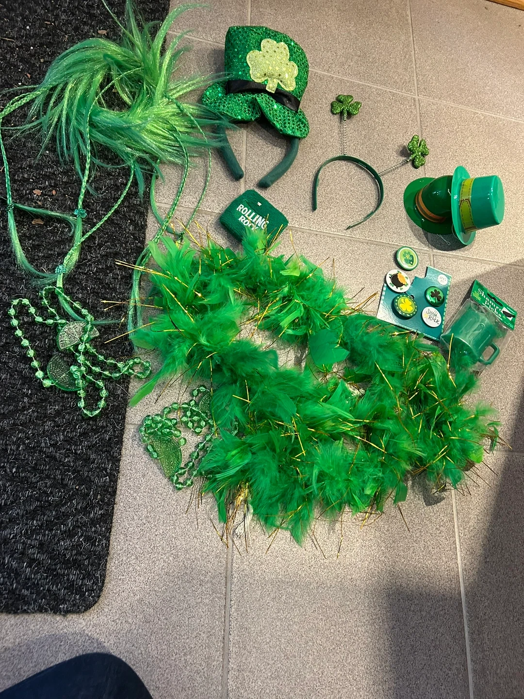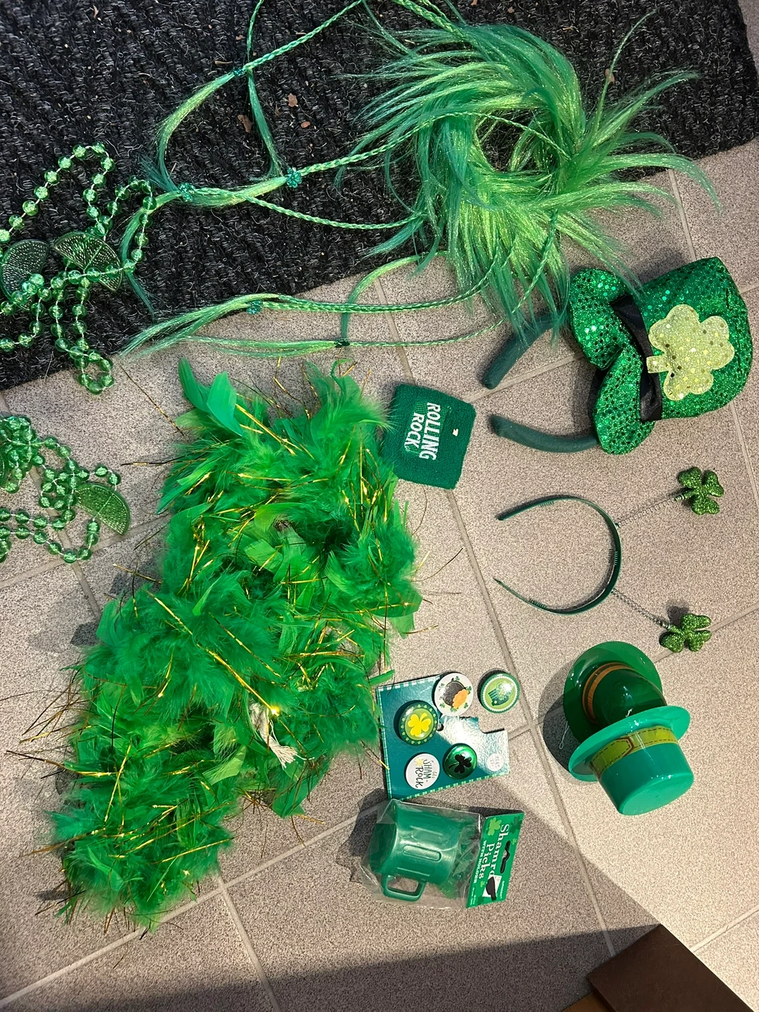 This lot includes various St. Patrick's Day themed party accessories. Items feature shamrocks, pots of gold, and green colors. Includes hats, headbands, buttons, beads, and decorative picks. Little hats for dogs .Great for festive celebrations!