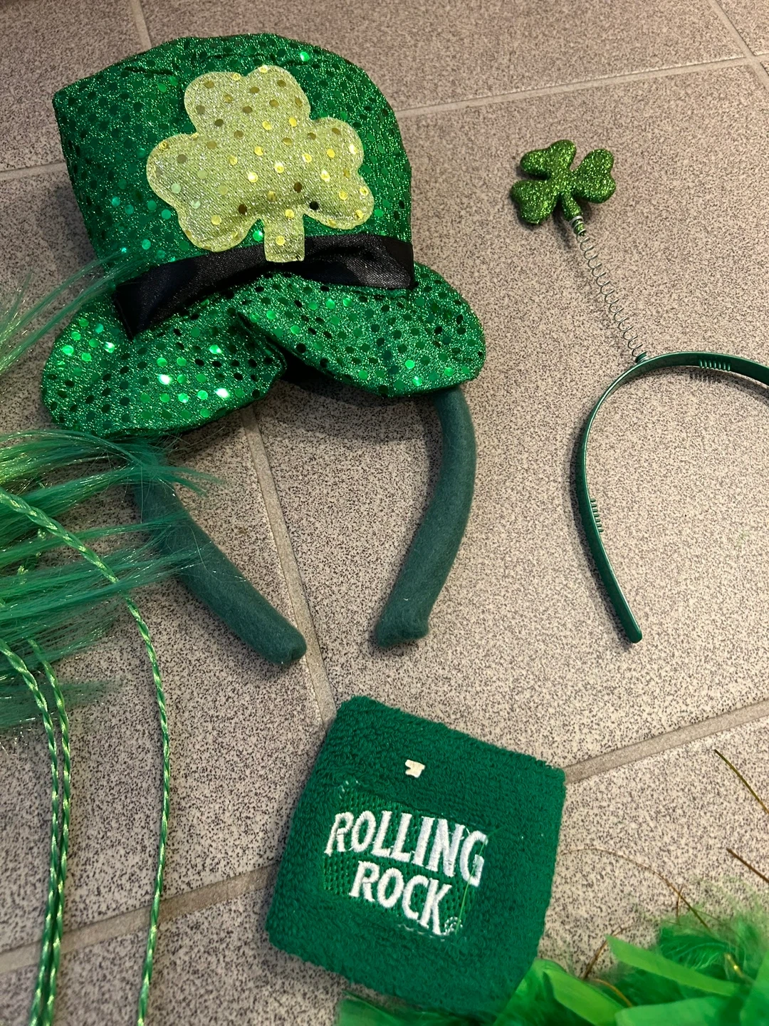 This lot includes various St. Patrick's Day themed party accessories. Items feature shamrocks, pots of gold, and green colors. Includes hats, headbands, buttons, beads, and decorative picks. Little hats for dogs .Great for festive celebrations!