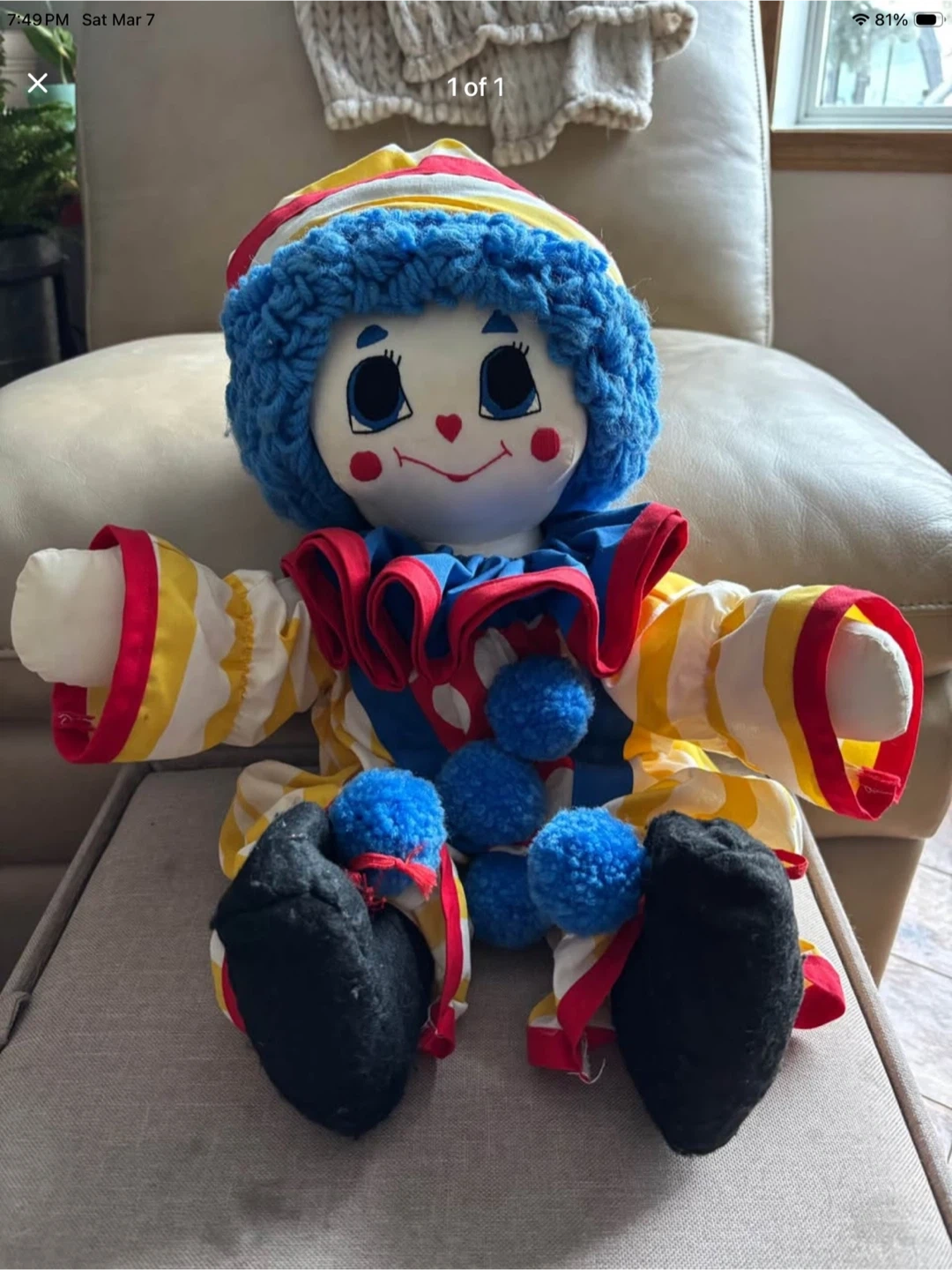 Buy & SellPlush Clown DollPlush Clown Doll$40Adorable handmade plush clown doll with a colourful outfit. It has a soft blue yarn wig and bright red rosy cheeks.ConditionLike newAge1-2 yearsWHERE TO MEETCheck LocationView MapSELLERJanCarvel100 reviews0 chats·0 favorites·3 viewsSEND CHAT TO SELLERHi Jan! I’m interested in your listing.Hi Jan! I’m interested in your listing.Get the Karrot app to chatSign In to chat