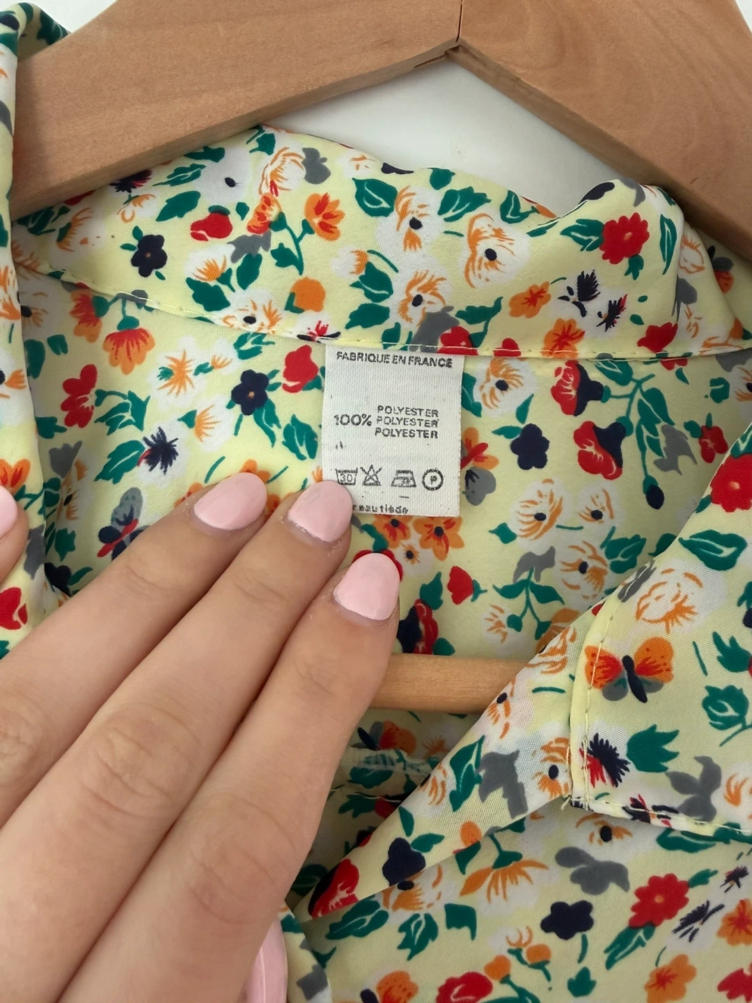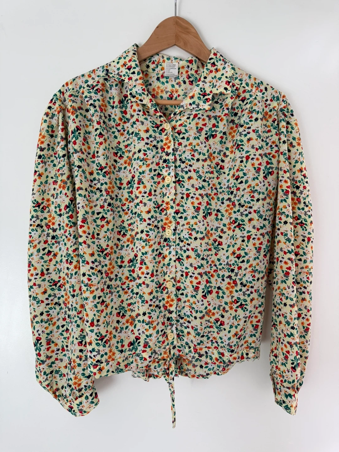 Vintage springtime light yellow blouse with a colourful floral print. 💐 It features a tie detail at the hem which can be used to adjust the size. This shirt is manufactured in France!! Fits a size small-medium.