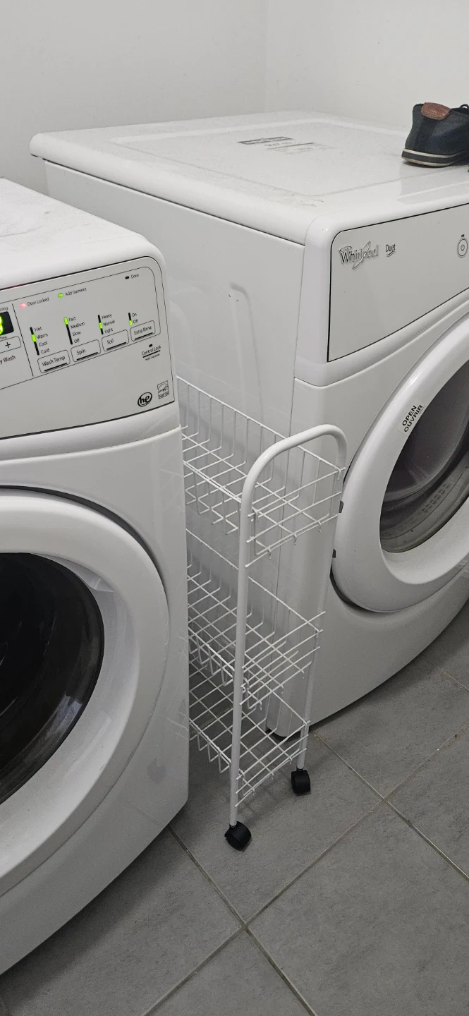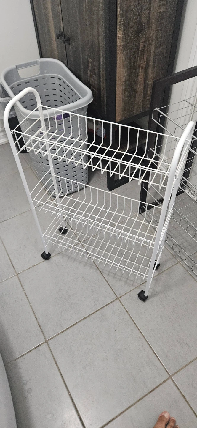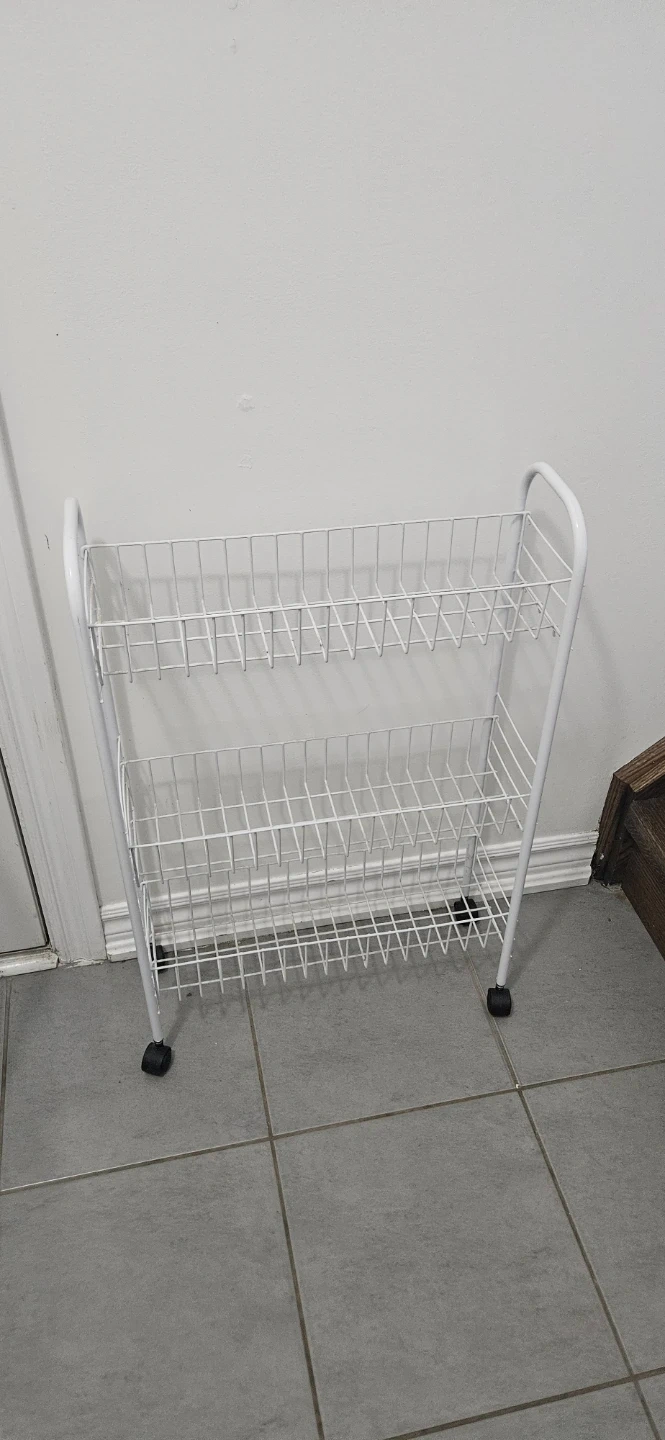 Selling a handy white rolling laundry cart! It's perfect for small spaces and makes moving laundry around a breeze. It has two shelves for sorting and organizing your clothes. The wheels are in great shape and roll smoothly.