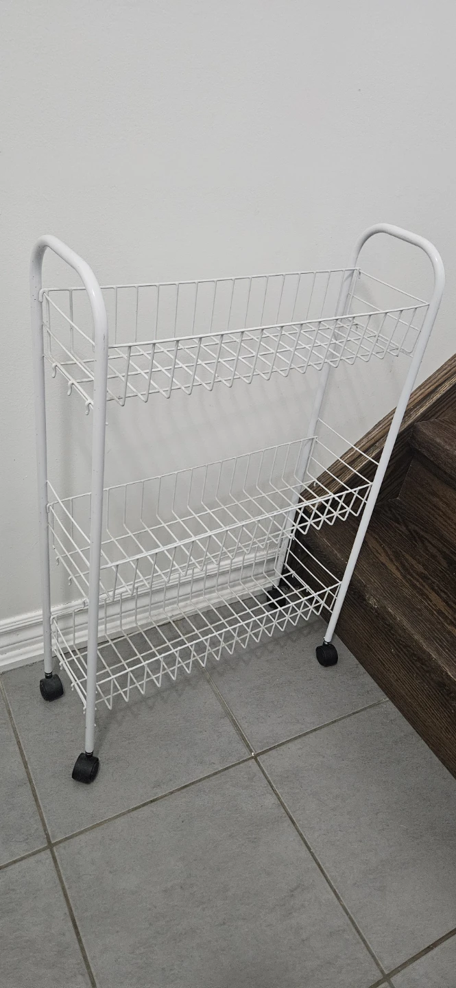 Selling a handy white rolling laundry cart! It's perfect for small spaces and makes moving laundry around a breeze. It has two shelves for sorting and organizing your clothes. The wheels are in great shape and roll smoothly.