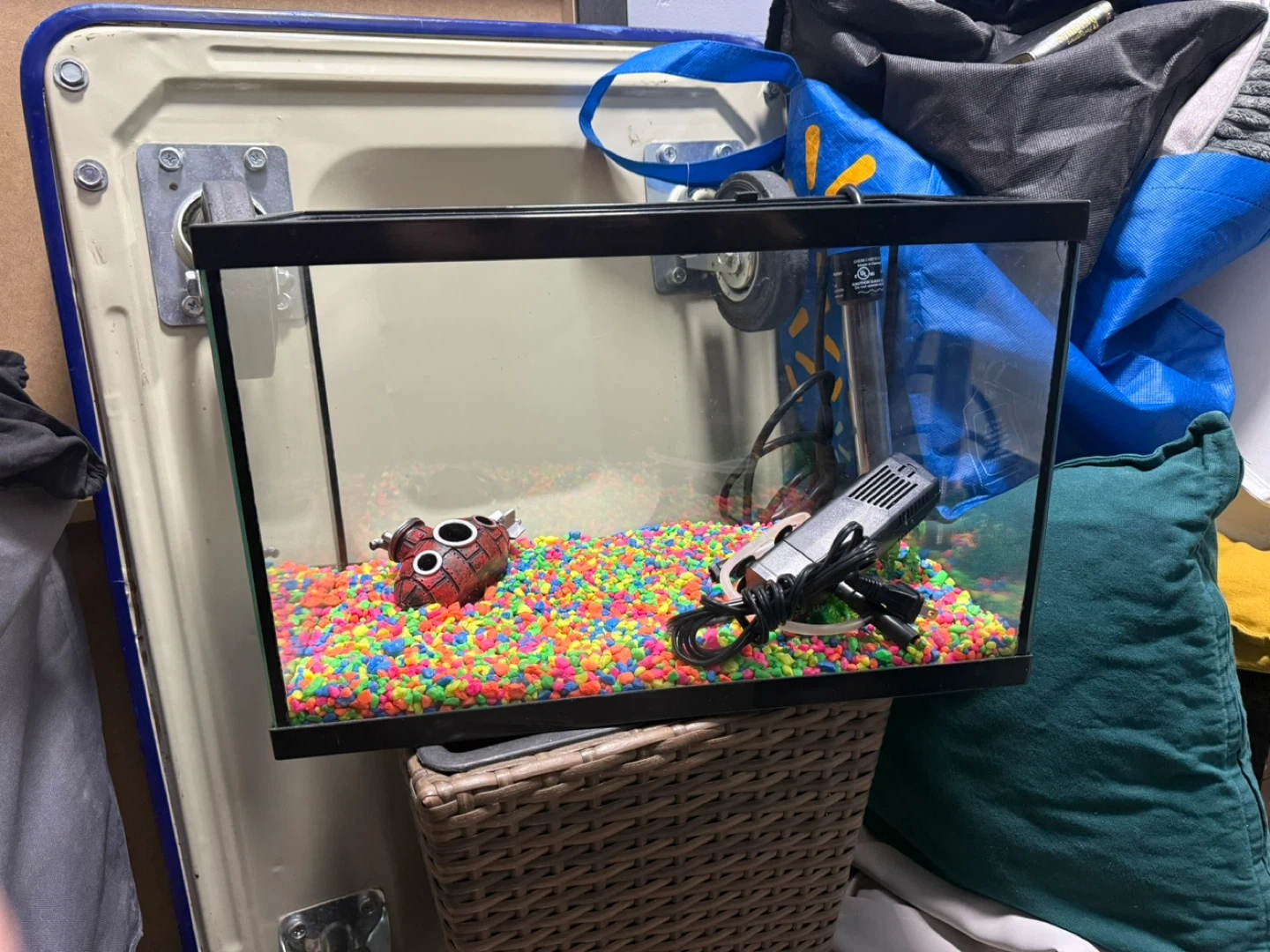 This is a complete starter aquarium kit! It includes a glass tank, a heater, and colourful gravel. All components are ready to go for setting up your new aquatic home. Perfect for beginner fish keepers!