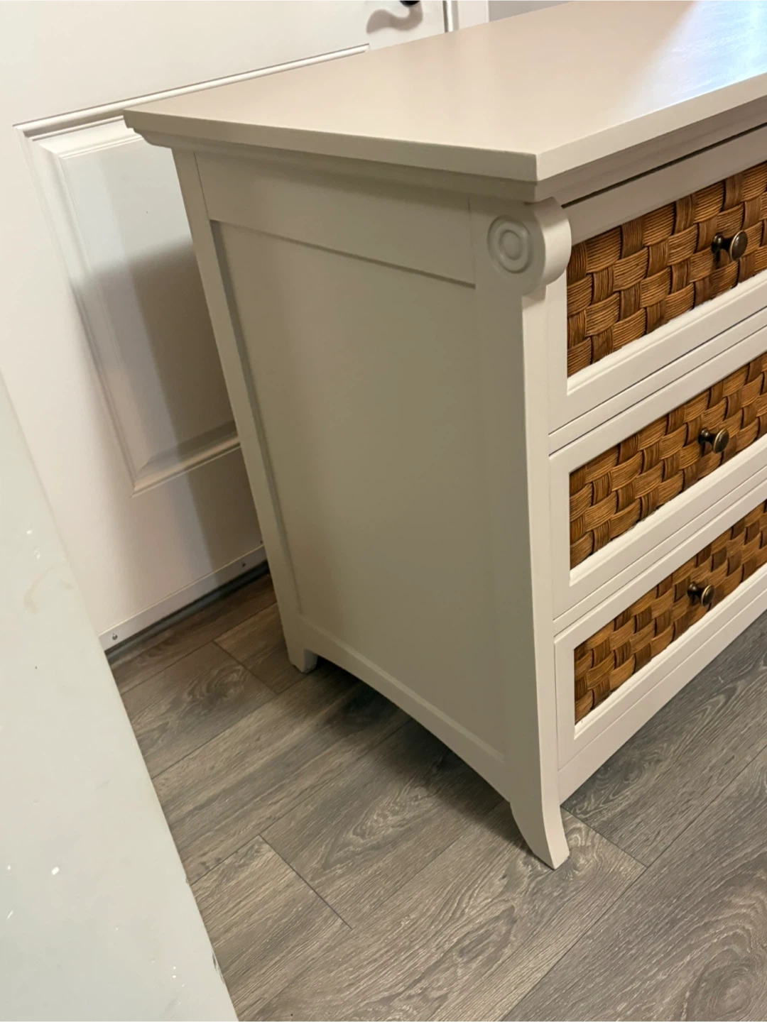 Refresh your bedroom with this charming refinished dresser in custom taupe, perfect for adding a touch of rustic elegance to any space. This dresser has been gently used, so it comes with a bit of character that a brand-new piece just can't match! The woven drawer fronts provide a unique texture and visual appeal. The drawers slide smooth with locking features.