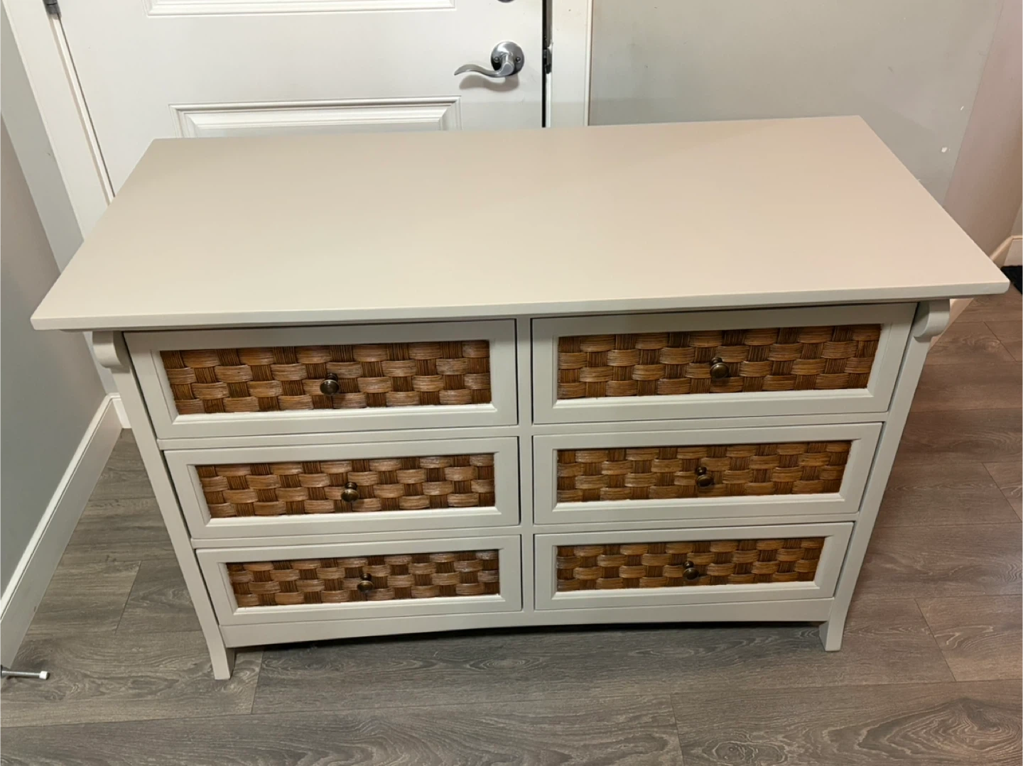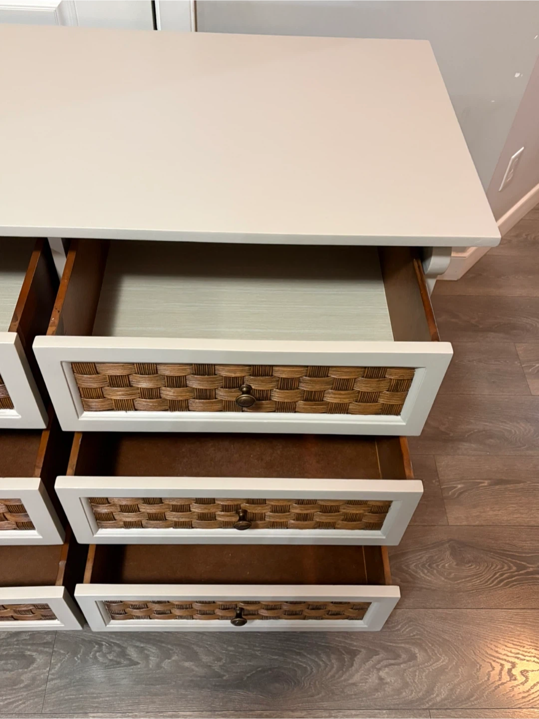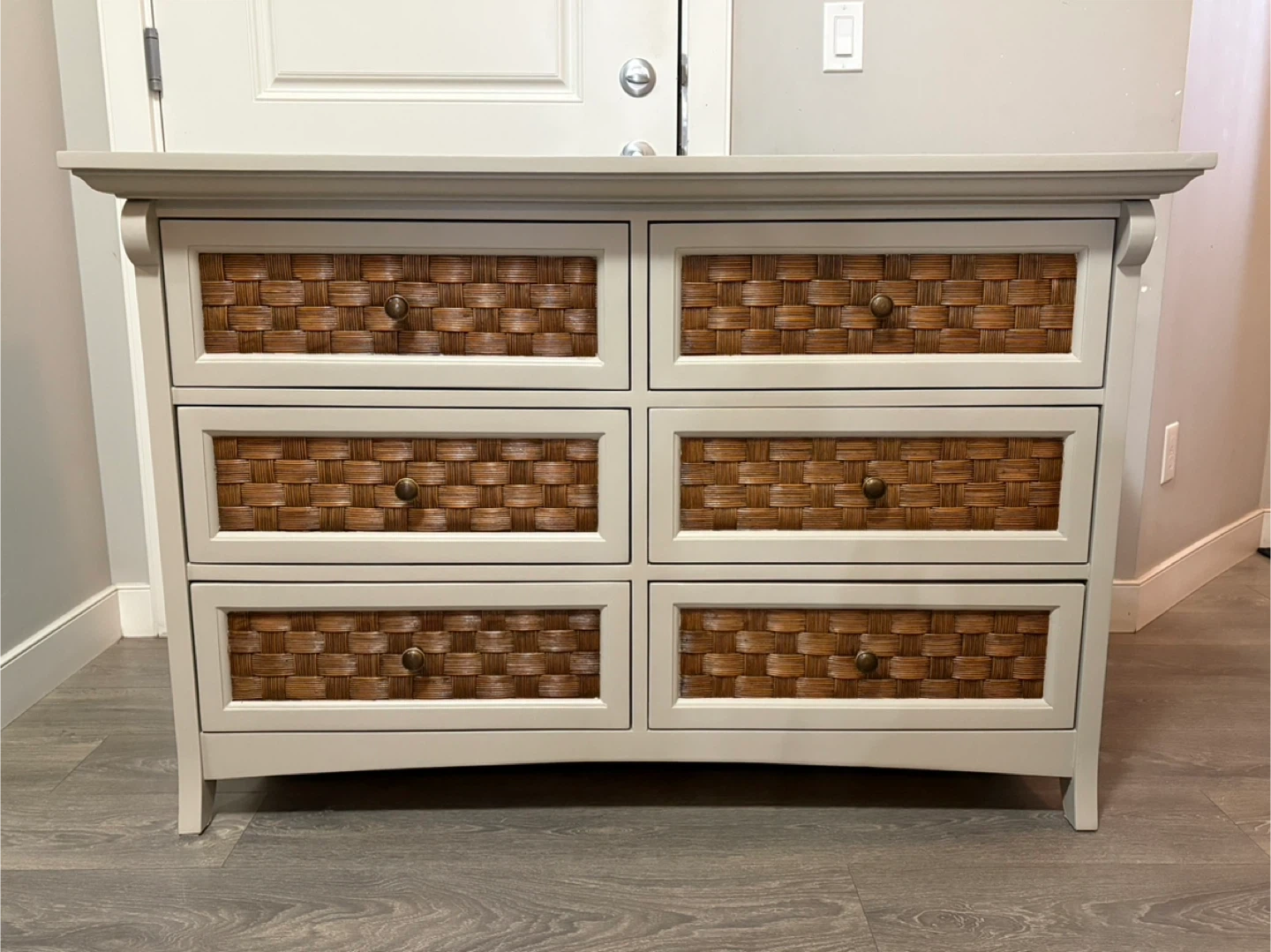 Refresh your bedroom with this charming refinished dresser in custom taupe, perfect for adding a touch of rustic elegance to any space. This dresser has been gently used, so it comes with a bit of character that a brand-new piece just can't match! The woven drawer fronts provide a unique texture and visual appeal. The drawers slide smooth with locking features.