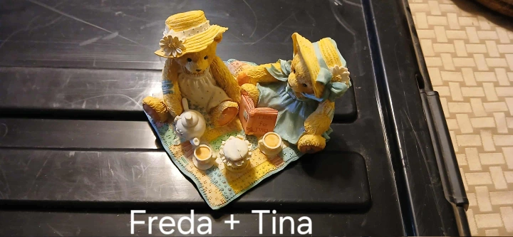 This is a cute Frederic & Tina bear figurine. It features two bears having a tea party on a quilt. One bear is reading a book titled "Tea for Two".