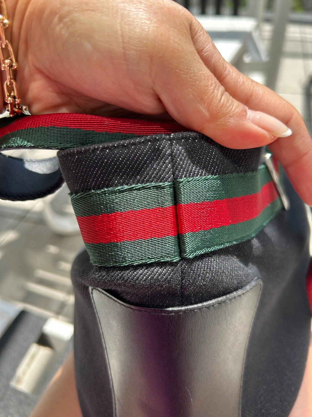 Authentic Gucci Denim Web Tote Bag - Black with Striped Handle
