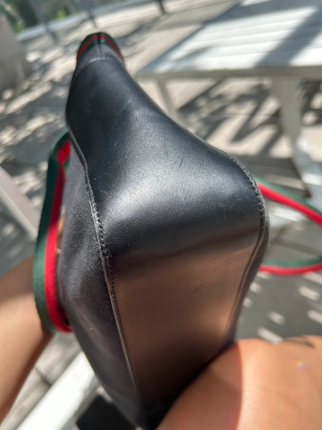 This is a Gucci tote bag in black with the classic Gucci striped handle. It's in great condition and ready for a new home! Perfect for everyday use or a stylish outing.