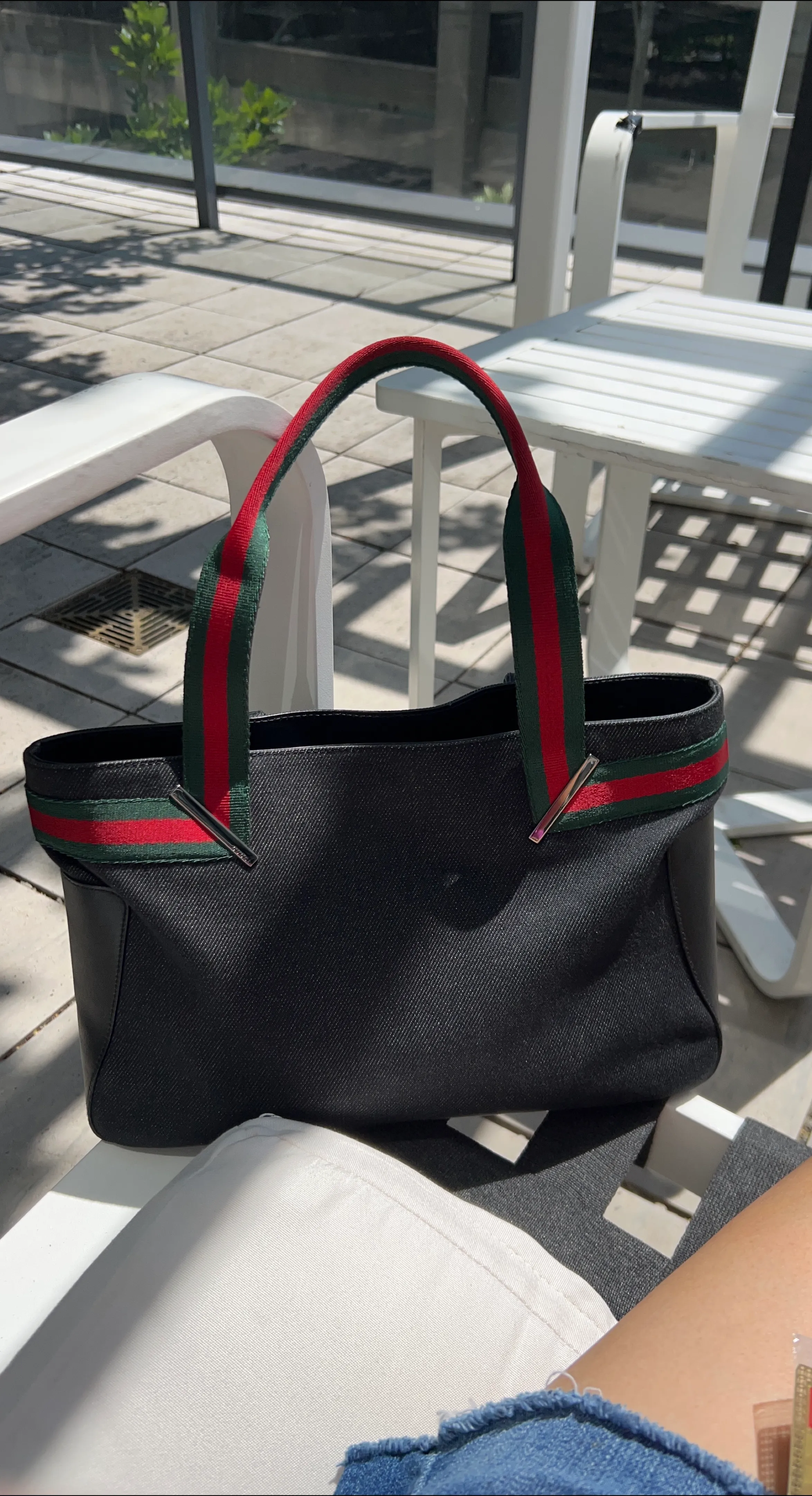 This is a Gucci tote bag in black with the classic Gucci striped handle. It's in great condition and ready for a new home! Perfect for everyday use or a stylish outing.