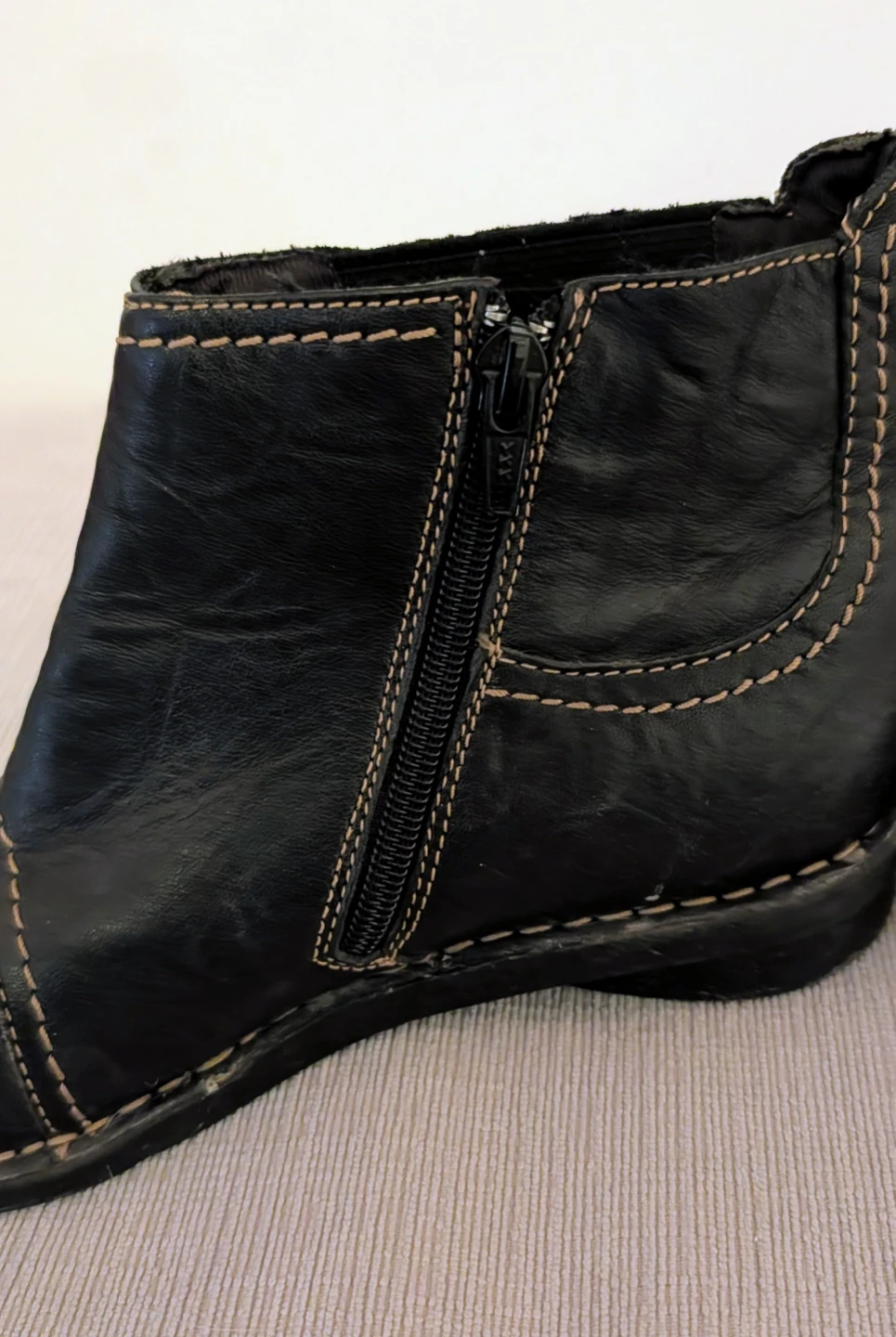 Selling a pair of Clarks ankle boots in black leather! They are a size 6M and feature a stylish design with stitching details and a convenient side zipper. Perfect for adding a touch of edge to your outfit!