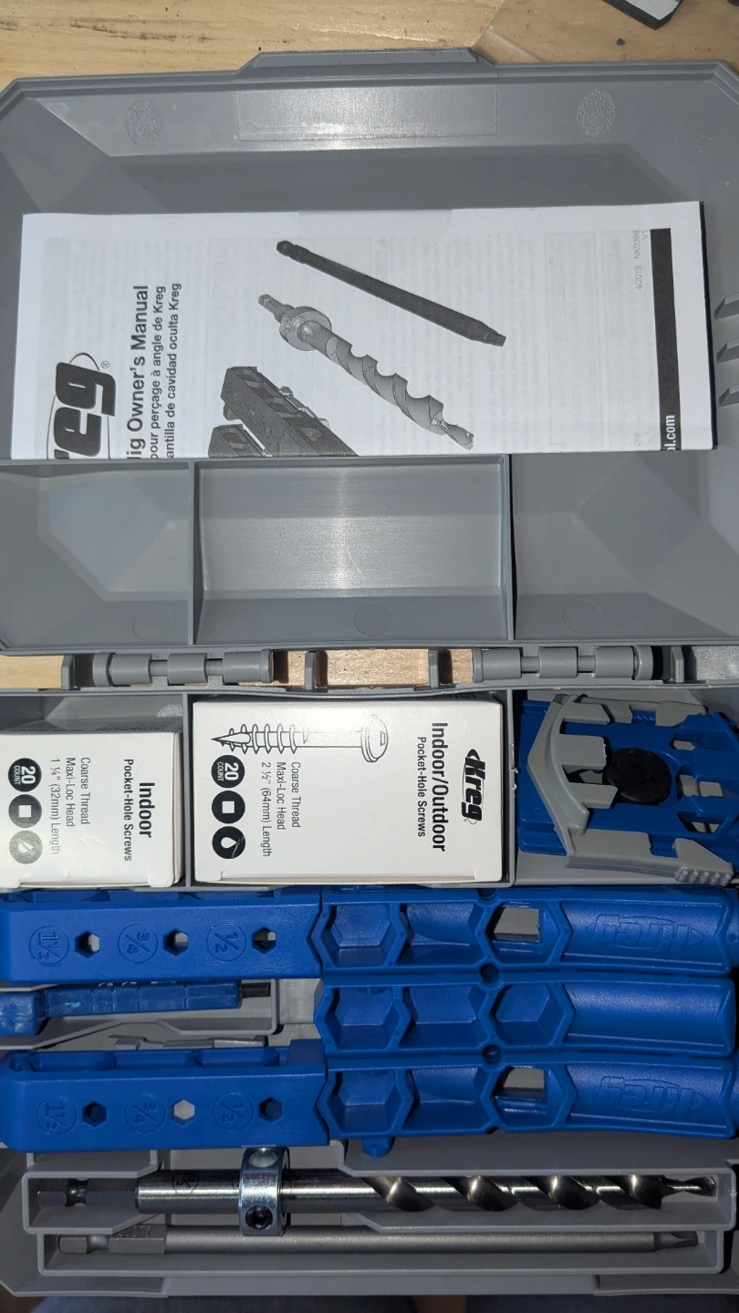 18Selling a Kreg Pocket-Hole Jig kit! It comes with the owner's manual, drill bits, screws, and the blue jig itself. Everything you need to get started with pocket-hole joinery is included in the box