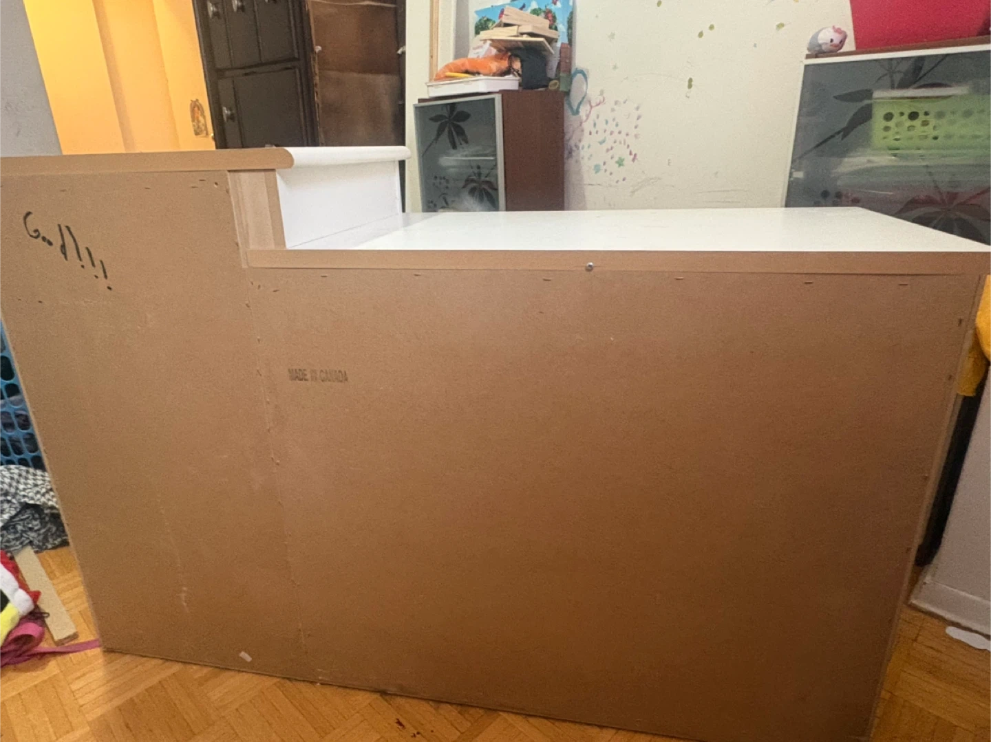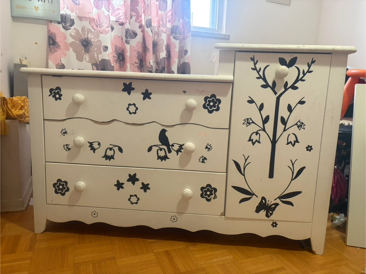 White dresser with cute black decals, including flowers, a bird, and a butterfly. It features 6 drawers and a cabinet door on the right side. Made in Canada. Dimensions: 56" width, 36" height, 21" depth. This dresser's playful design makes it a fun addition to a child's room!