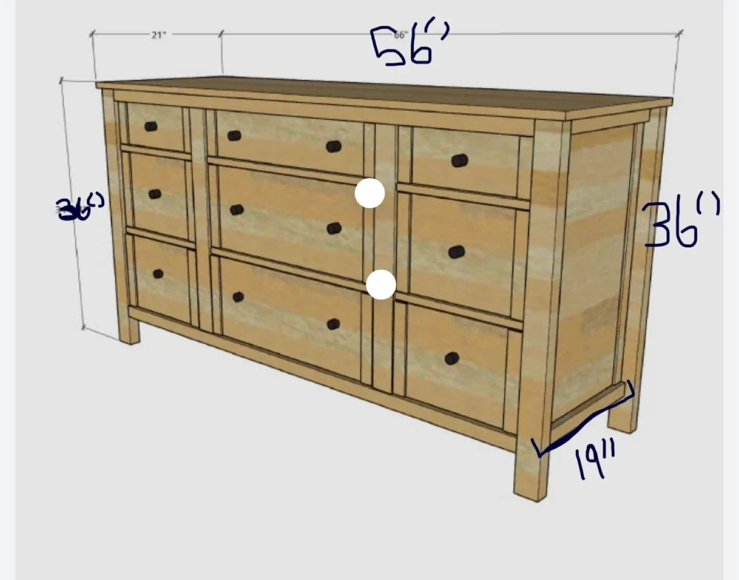 White dresser with cute black decals, including flowers, a bird, and a butterfly. It features 6 drawers and a cabinet door on the right side. Made in Canada. Dimensions: 56" width, 36" height, 21" depth. This dresser's playful design makes it a fun addition to a child's room!