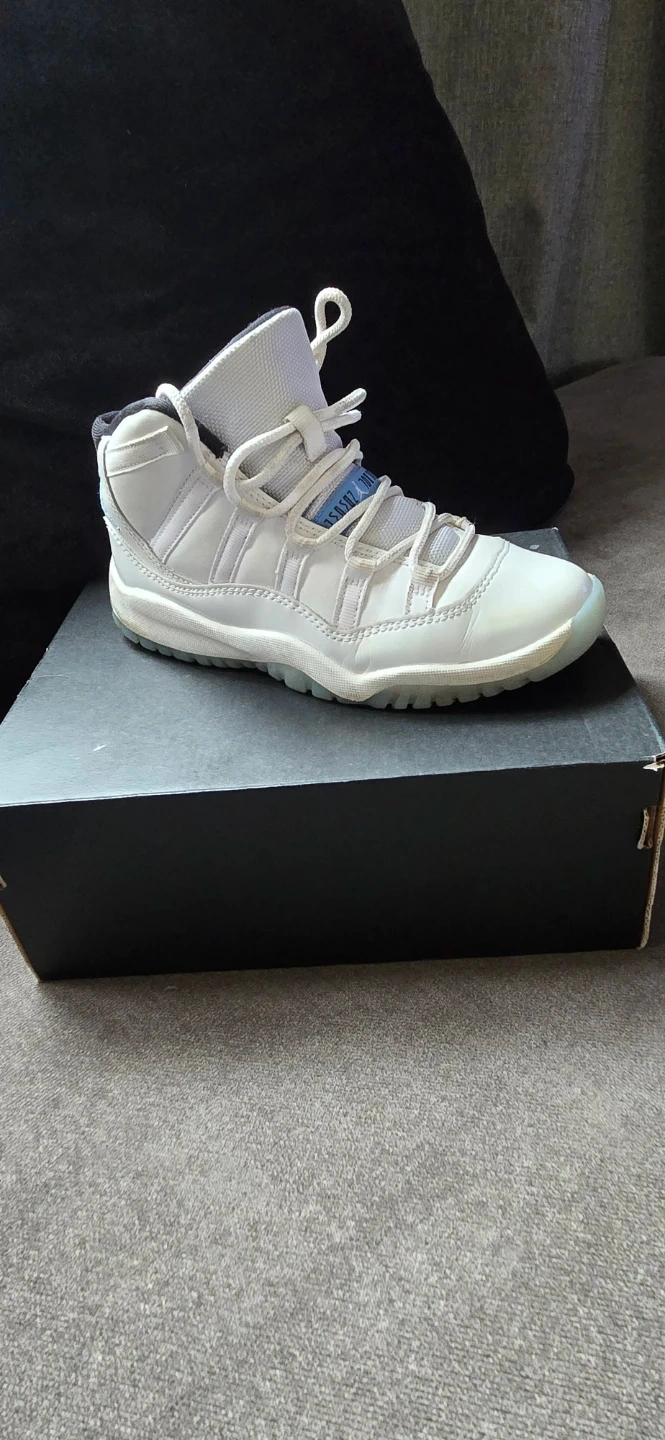 Classic white and blue Air Jordan 11 Retro Concord sneakers. Includes the original box. These kicks are a staple for any sneaker collection!
