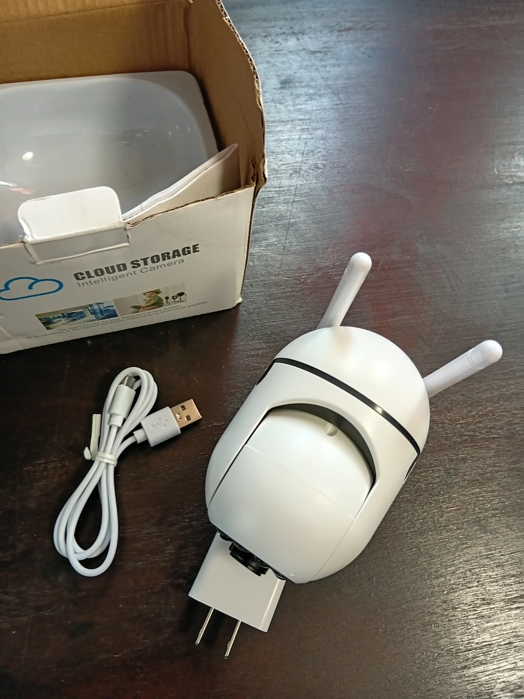 This is a white intelligent camera with cloud storage capabilities. It includes a USB charging cable and power adapter. The camera also features two antennas for better signal reception. It's designed for IP surveillance with high-resolution video.