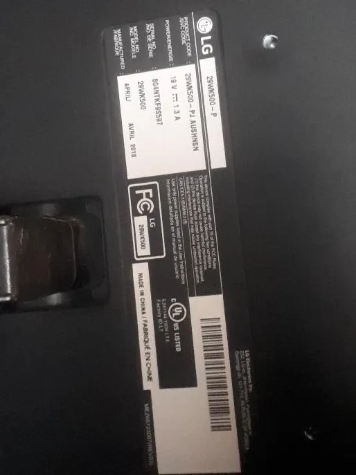 Selling an LG 29WK500-P monitor. The product code is 29WK500-PJ AUSHNSN. It requires 19 V and 1.3 A power. It was manufactured in April 2018.