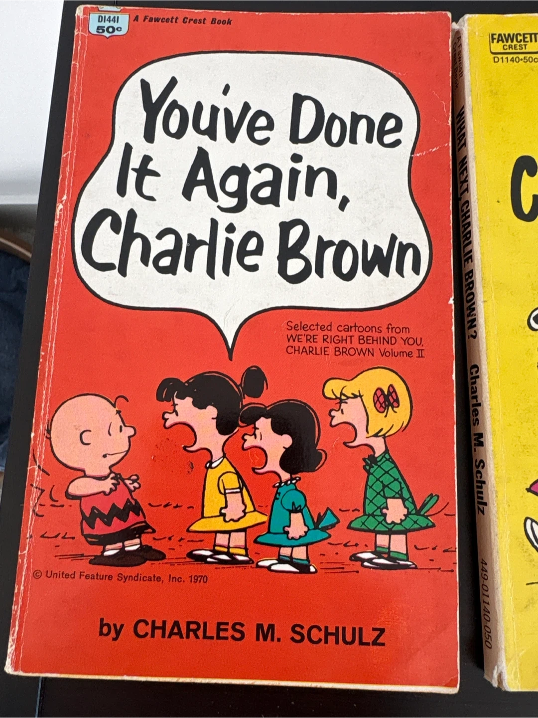 Three classic Peanuts comic books featuring Charlie Brown. Titles include 'You've Done It Again, Charlie Brown', 'What Next, Charlie Brown?', and 'You're a Brave Man, Charlie Brown'. These are collected cartoons by Charles M. Schulz. A great addition for any Peanuts fan!