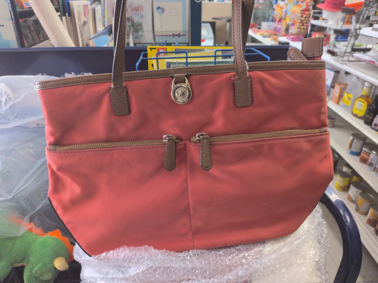 This is a Michael Kors tote bag in a lovely coral colour. It features two exterior zip pockets and has the iconic MK logo hardware. The material is durable nylon with leather trim.