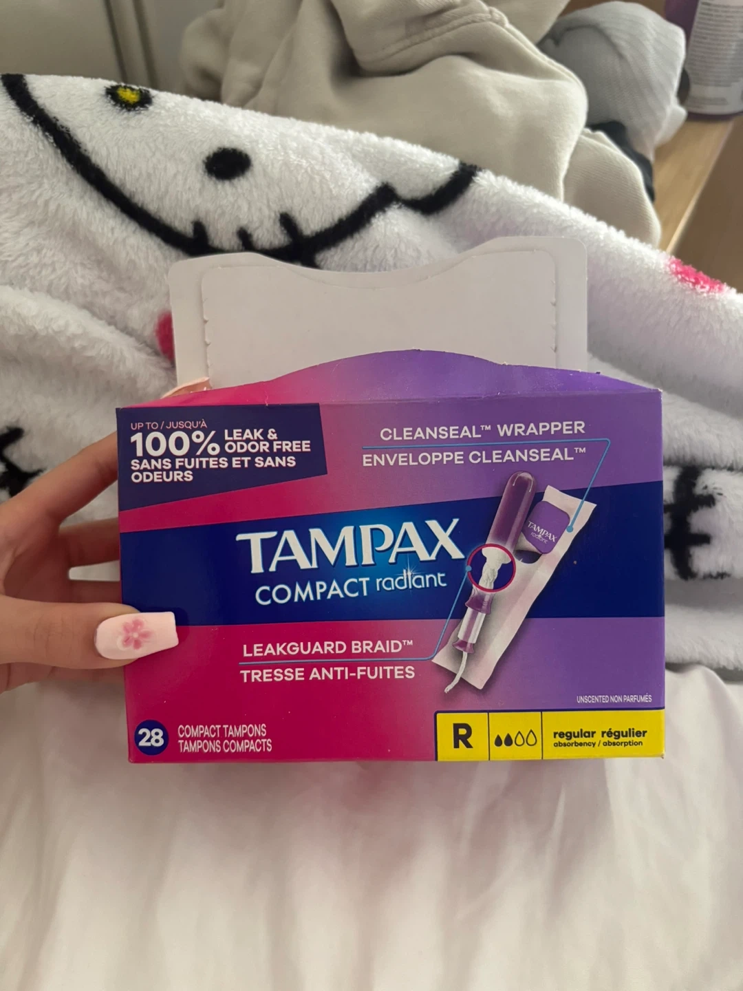 This box contains 28 Tampax Compact Radiant tampons. They offer regular absorbency and are leak and odor-free. The tampons are unscented.