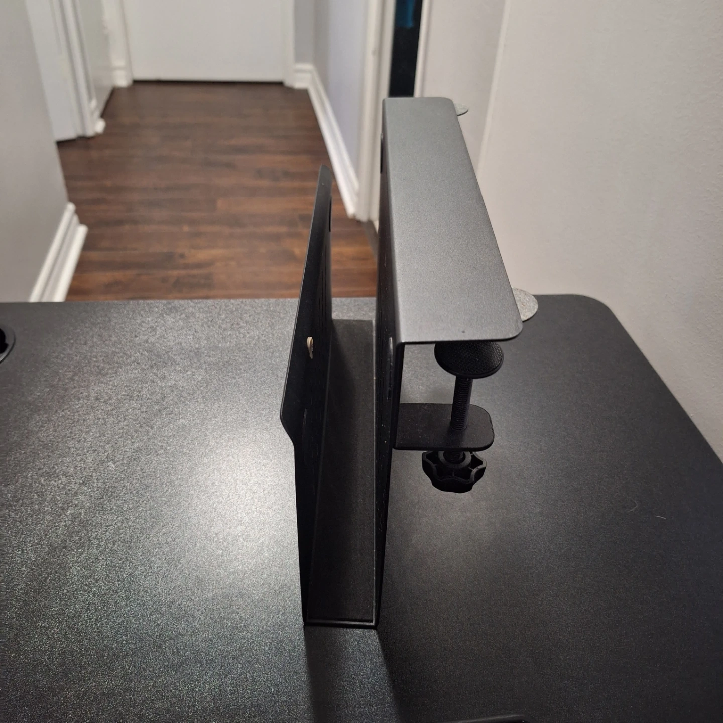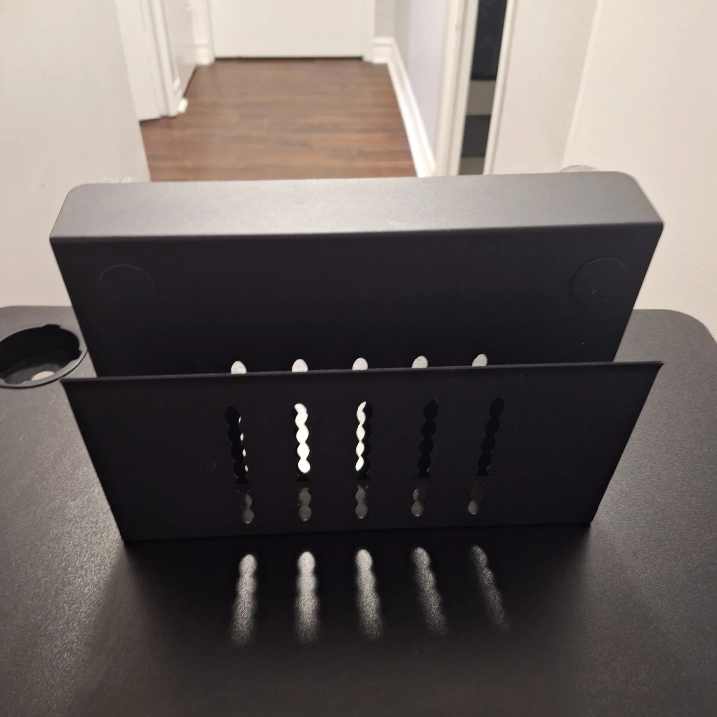 A black metal organizer that clamps onto a desk. It has a sleek, industrial design and features multiple slots for cable management or storage. This organizer is perfect for tidying up your workspace!