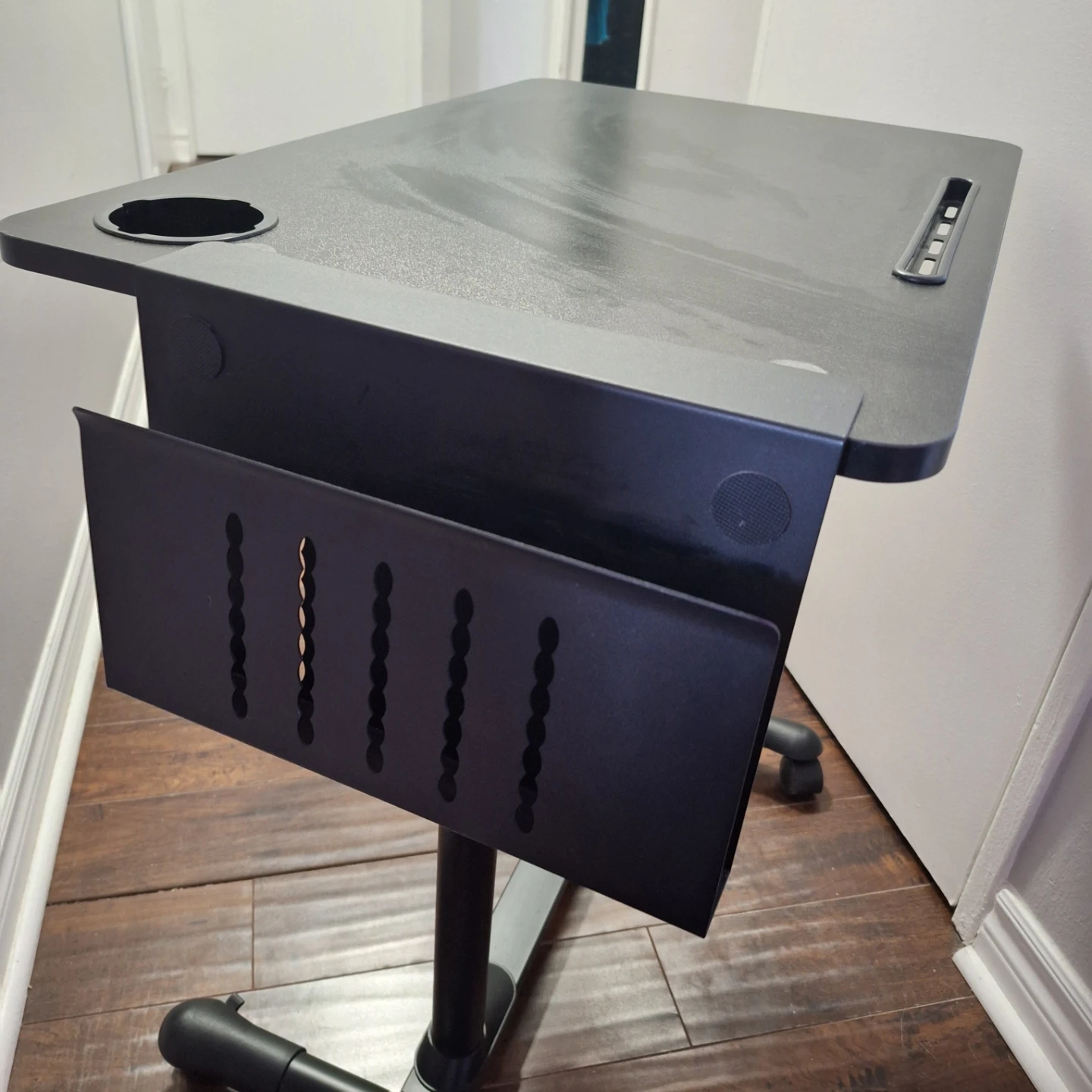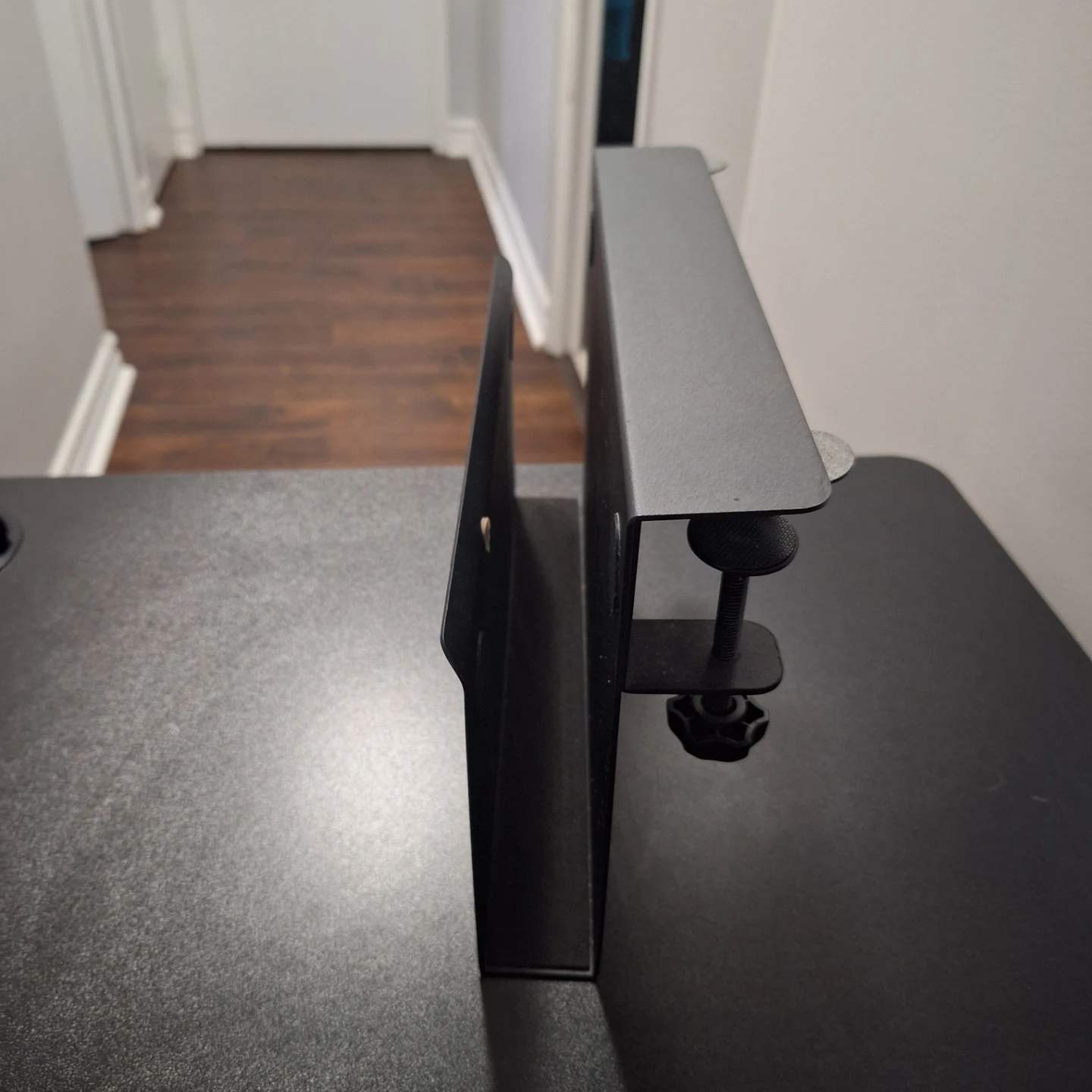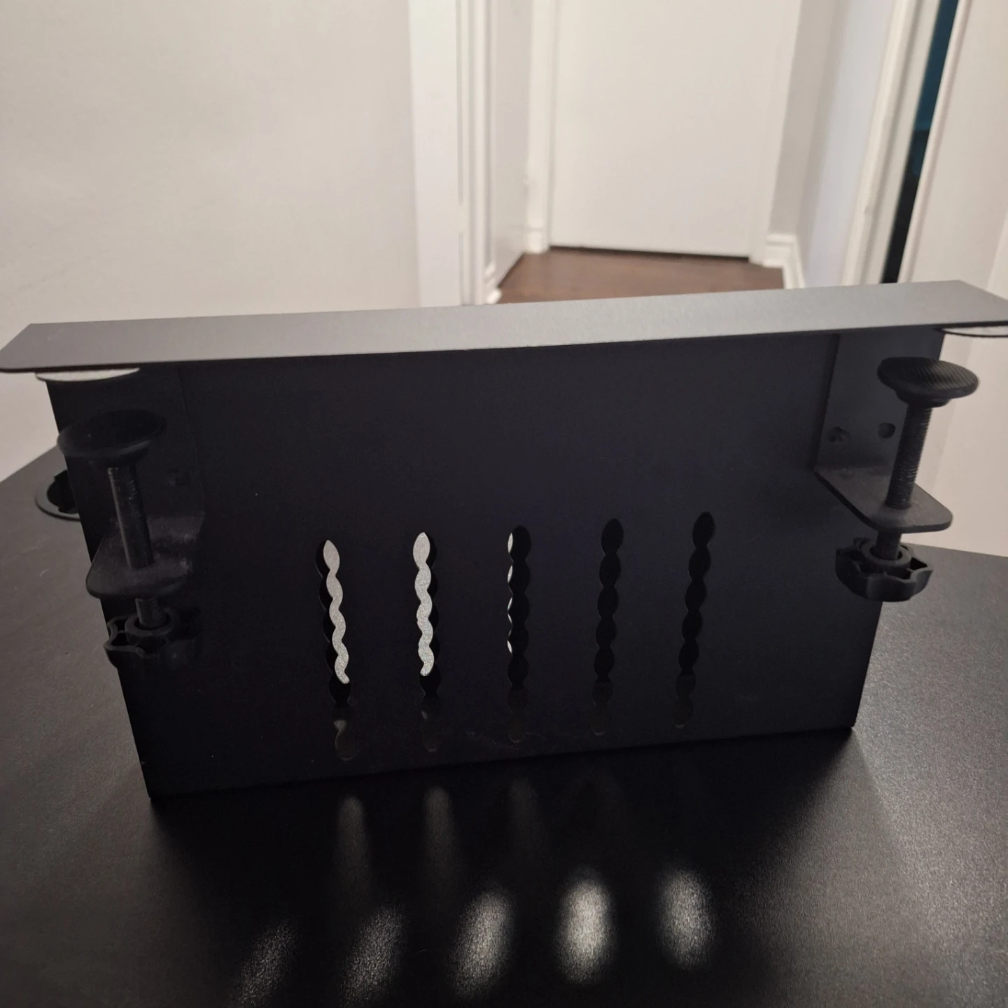 A black metal organizer that clamps onto a desk. It has a sleek, industrial design and features multiple slots for cable management or storage. This organizer is perfect for tidying up your workspace!