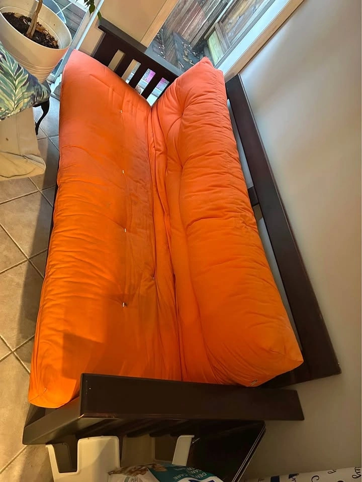 Used it in the kitchen as a sofa. Never slept on it. It has a couple of marks on the wood and the cushion has a small stain that might come out with washing. The cover is removable for washing and the cushion can be flipped over.
