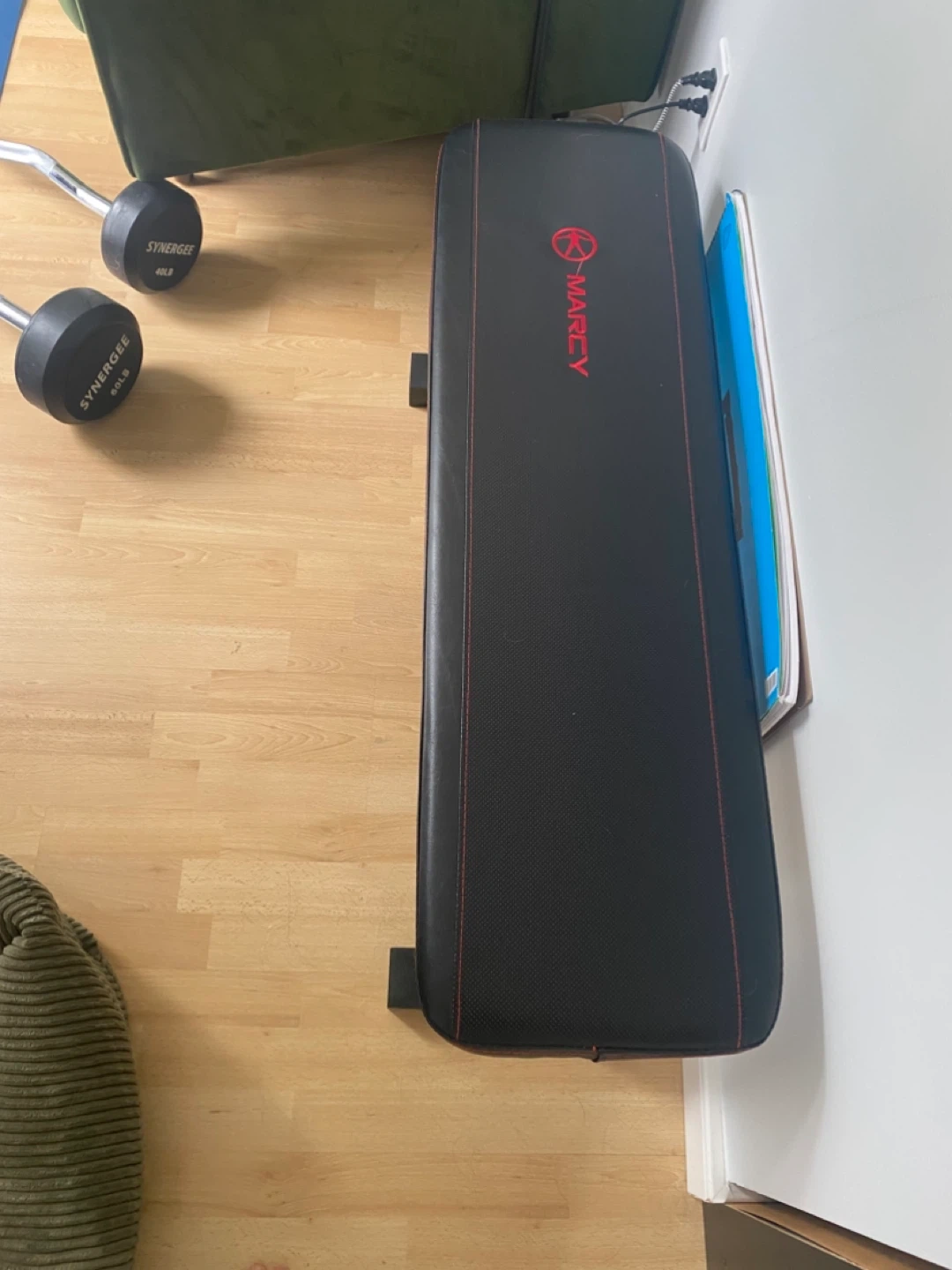 This Marcy exercise bench is great for home workouts. It's a sturdy, black padded bench with red stitching. It's suitable for various strength training exercises. Lightly used, still in great condition.