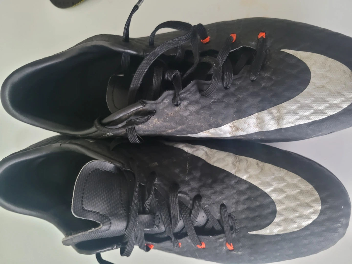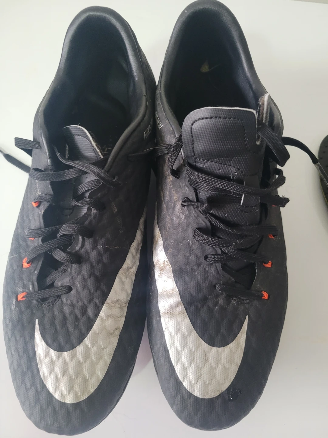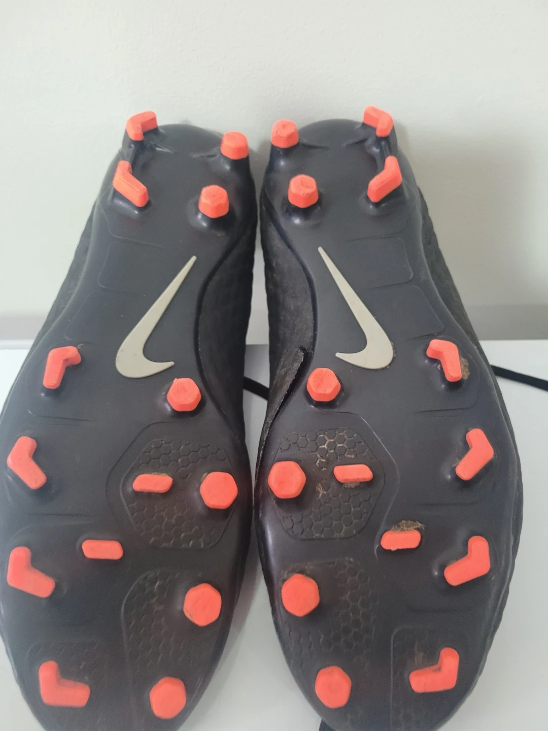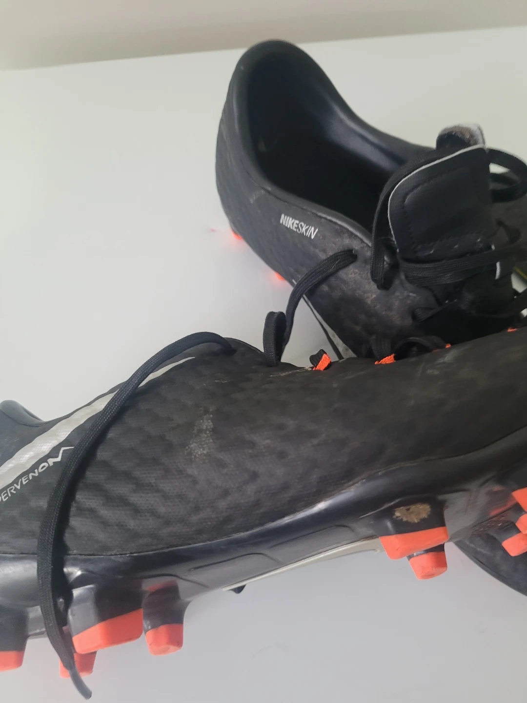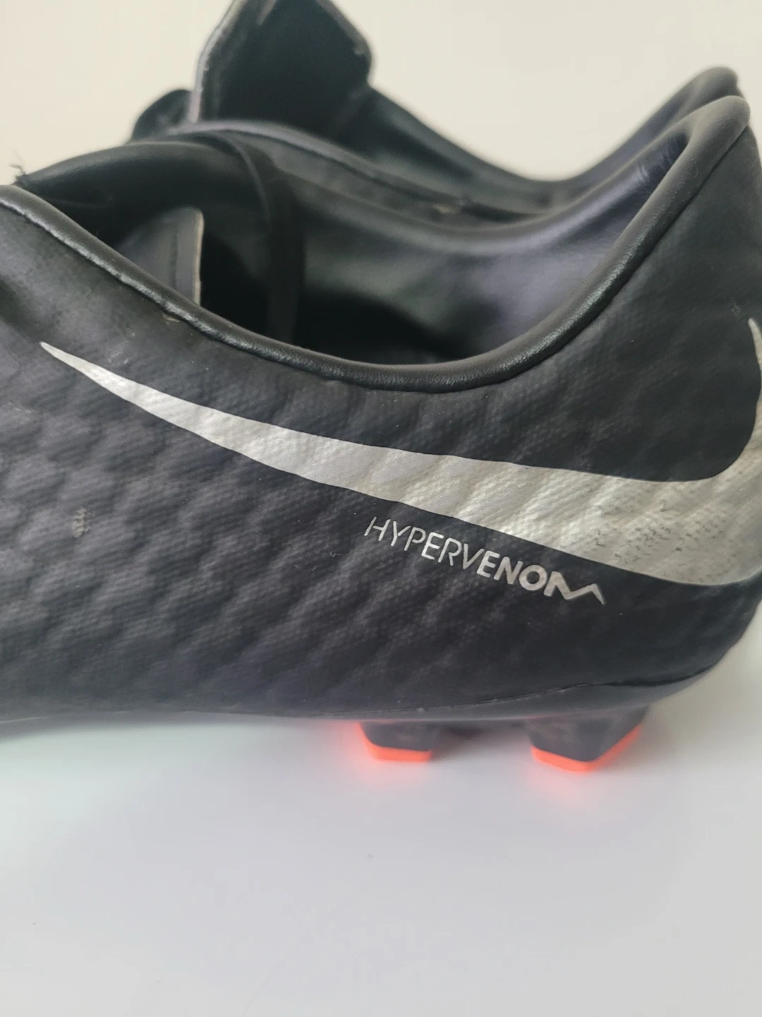 Black Nike Hypervenom football cleats with a synthetic upper. Features NikeSkin technology and orange studs for traction. Designed for play on firm ground.