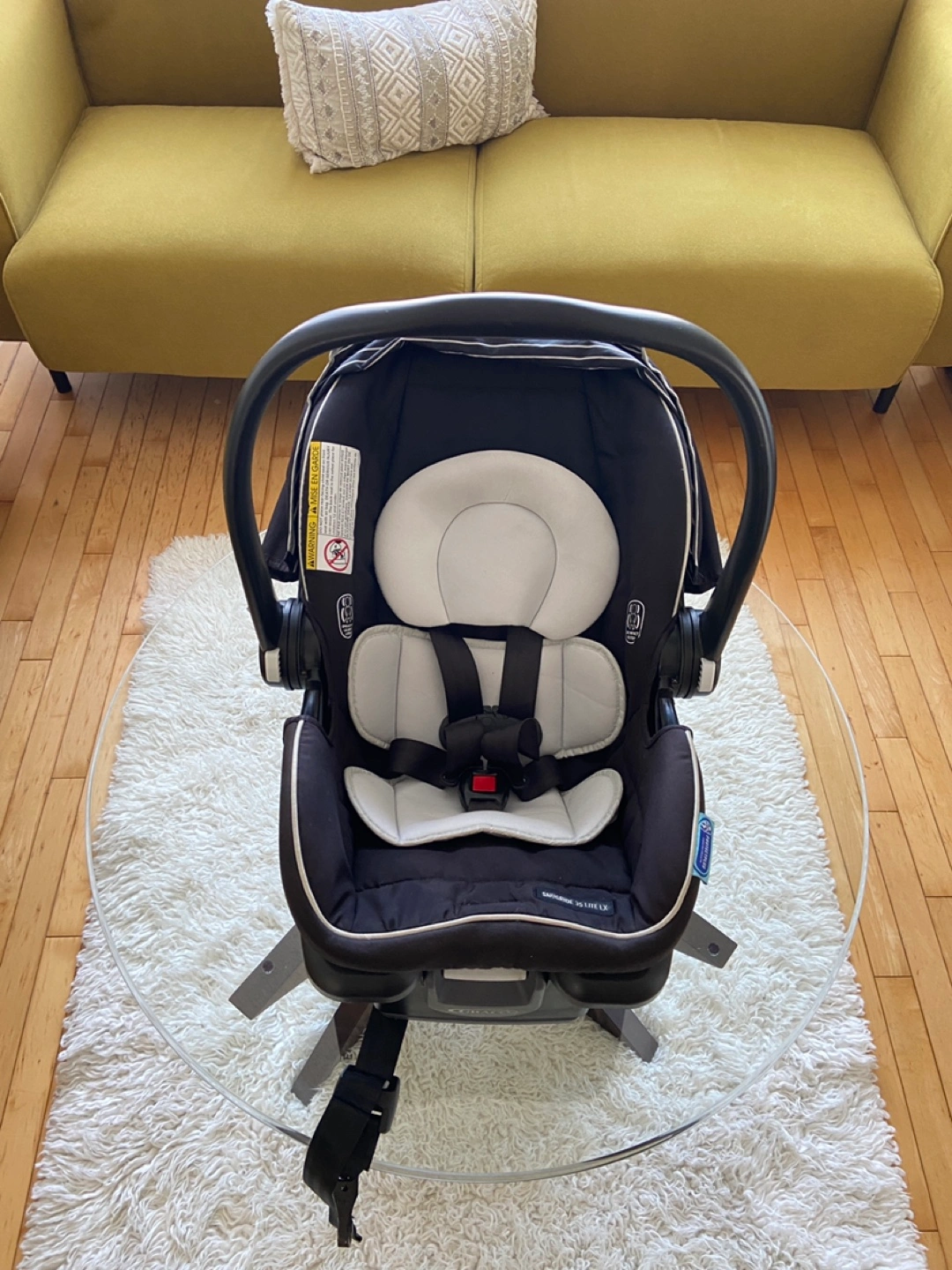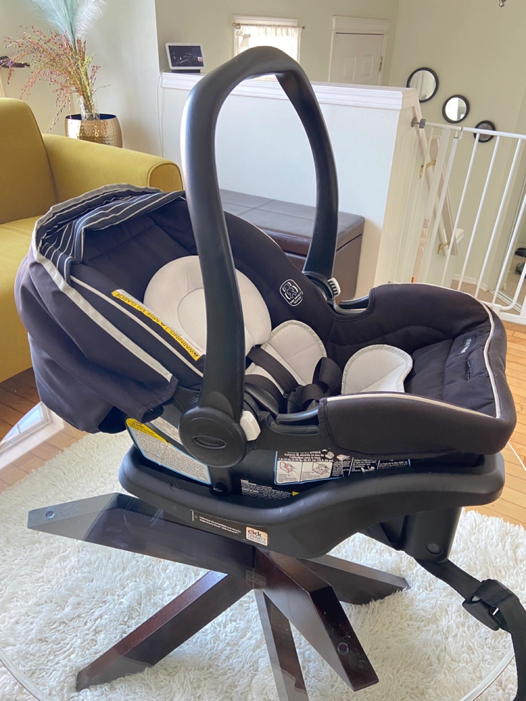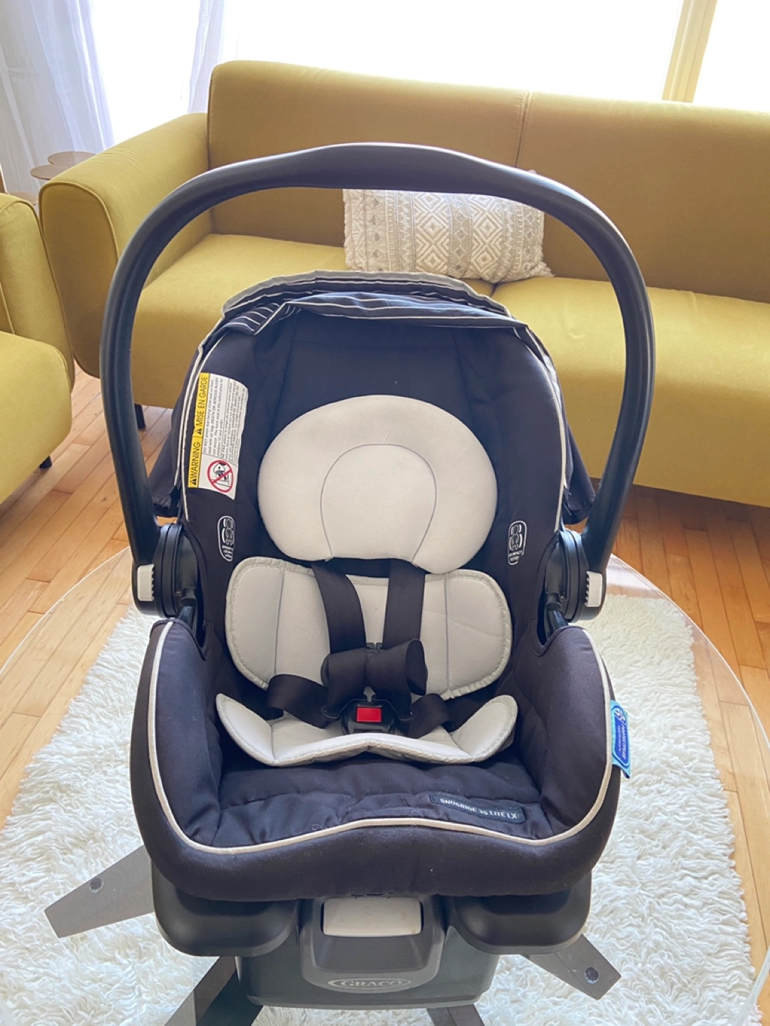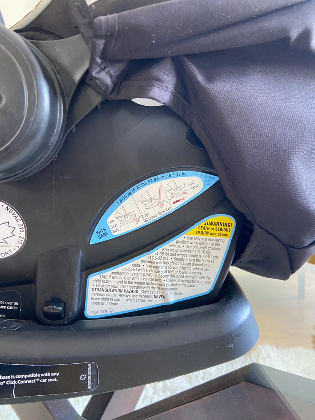 Infant car seat, black and white. Includes carrying handle. Used but in good condition. For children who weigh between 1.8 - 16 kg (4-35 Ib) and for children whose height is 42 - 81 cm (16.5 - 32 in)