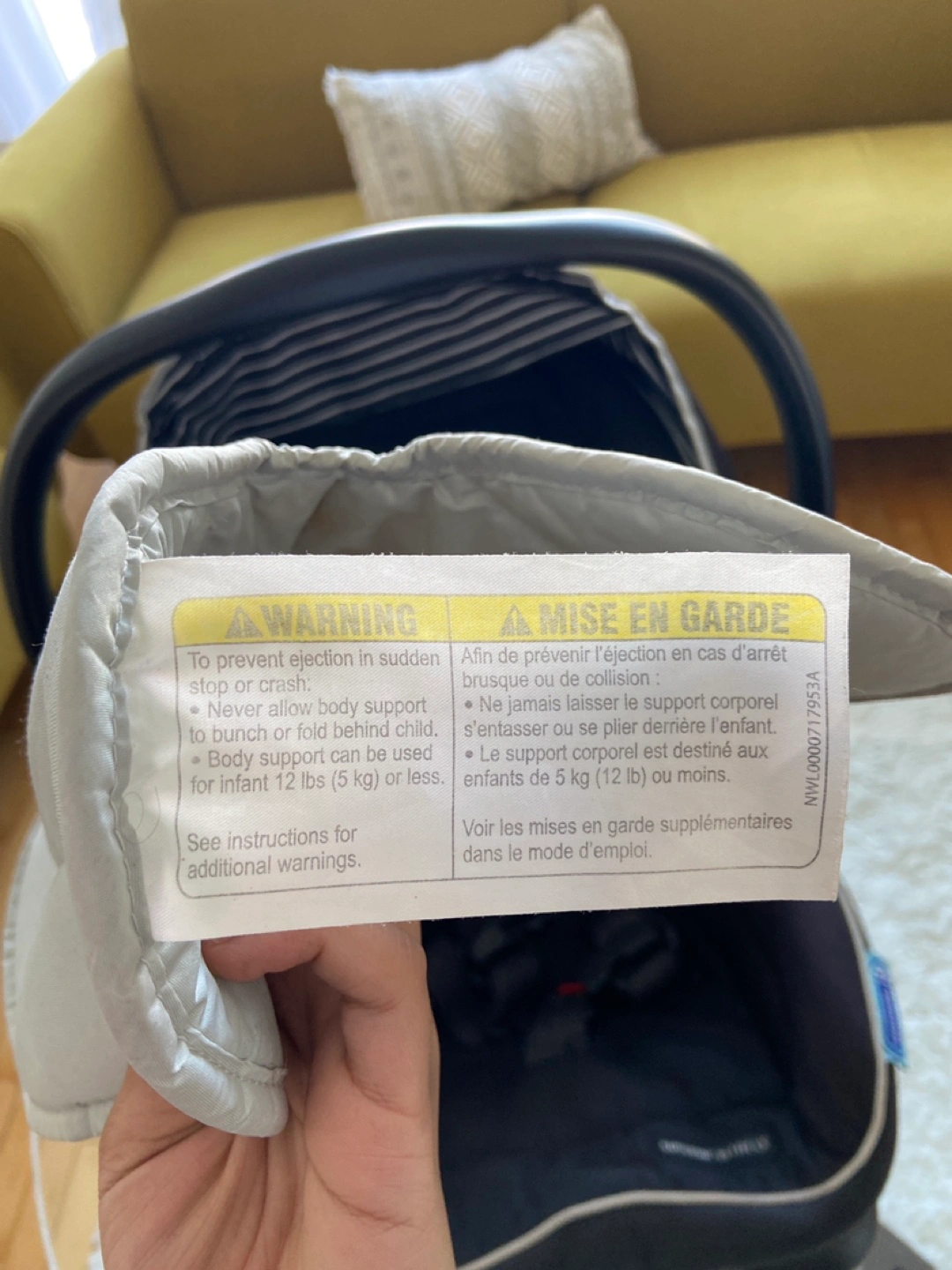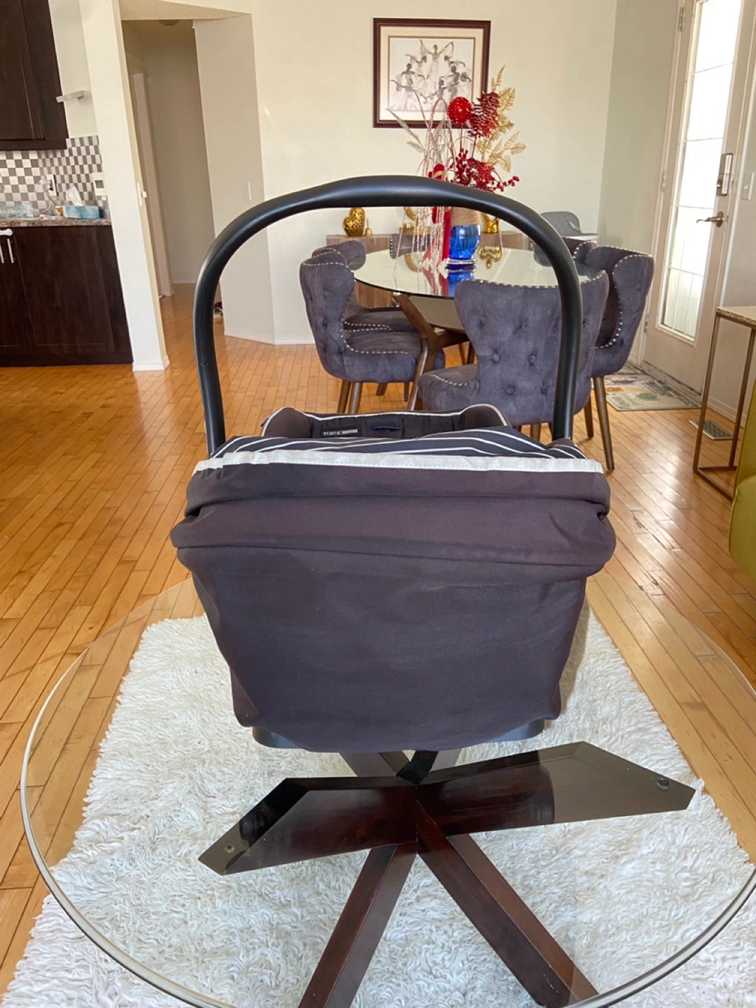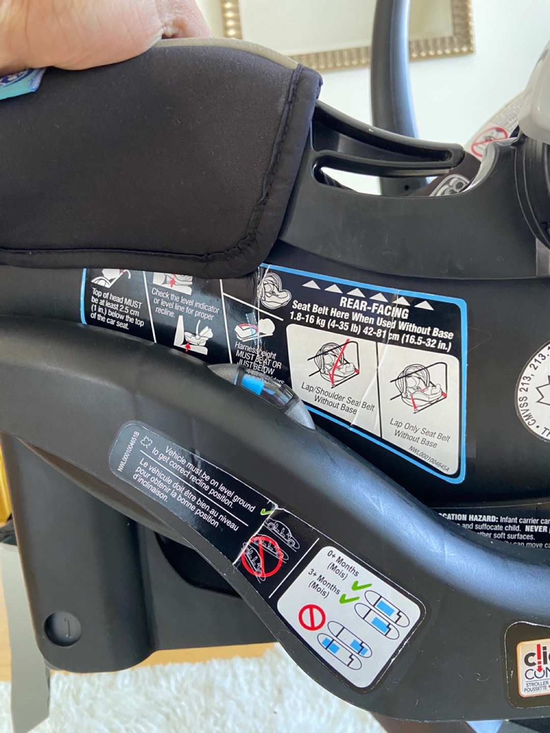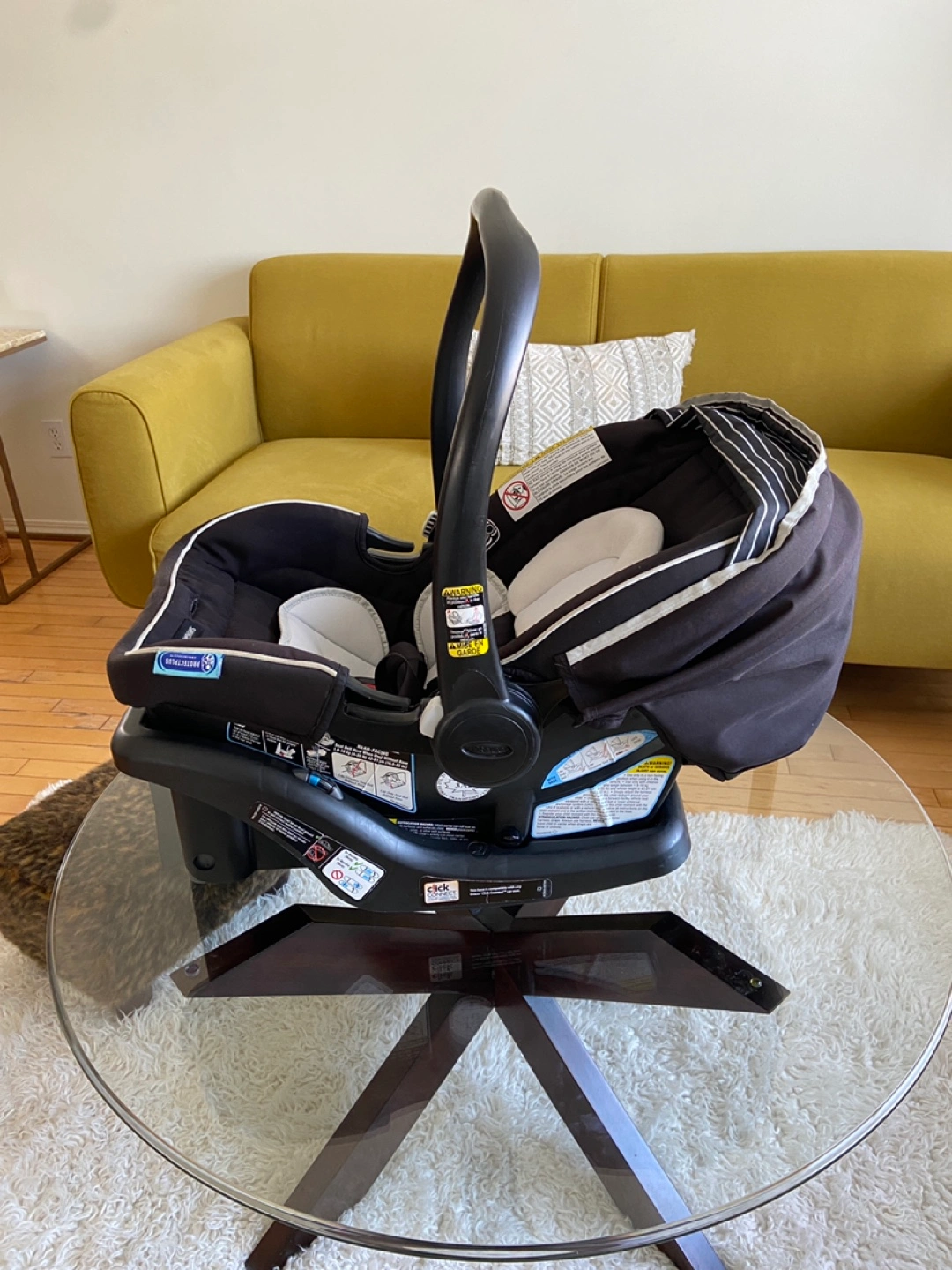 Infant car seat, black and white. Includes carrying handle. Used but in good condition. For children who weigh between 1.8 - 16 kg (4-35 Ib) and for children whose height is 42 - 81 cm (16.5 - 32 in)
