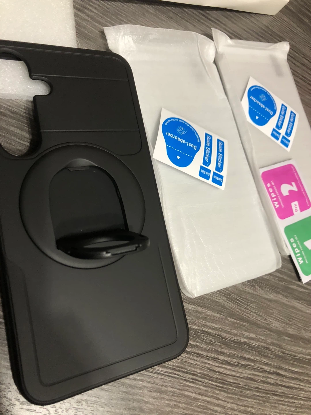 This is a new phone case designed for the Samsung S24 Plus in black. It includes a screen protector kit with wet and dry wipes, dust absorber, and guide stickers. The case features a built-in kickstand for convenient viewing.