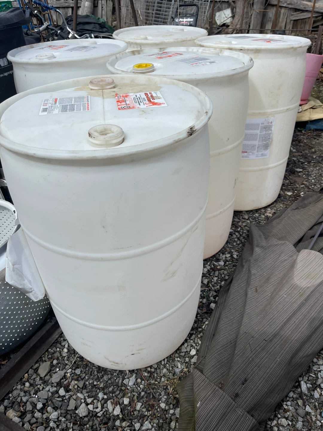 A set of five white plastic drums, each with a 55-gallon capacity. These drums are made of durable plastic and feature secure screw-top lids. They're suitable for storage or transport. $25.00 per dum.