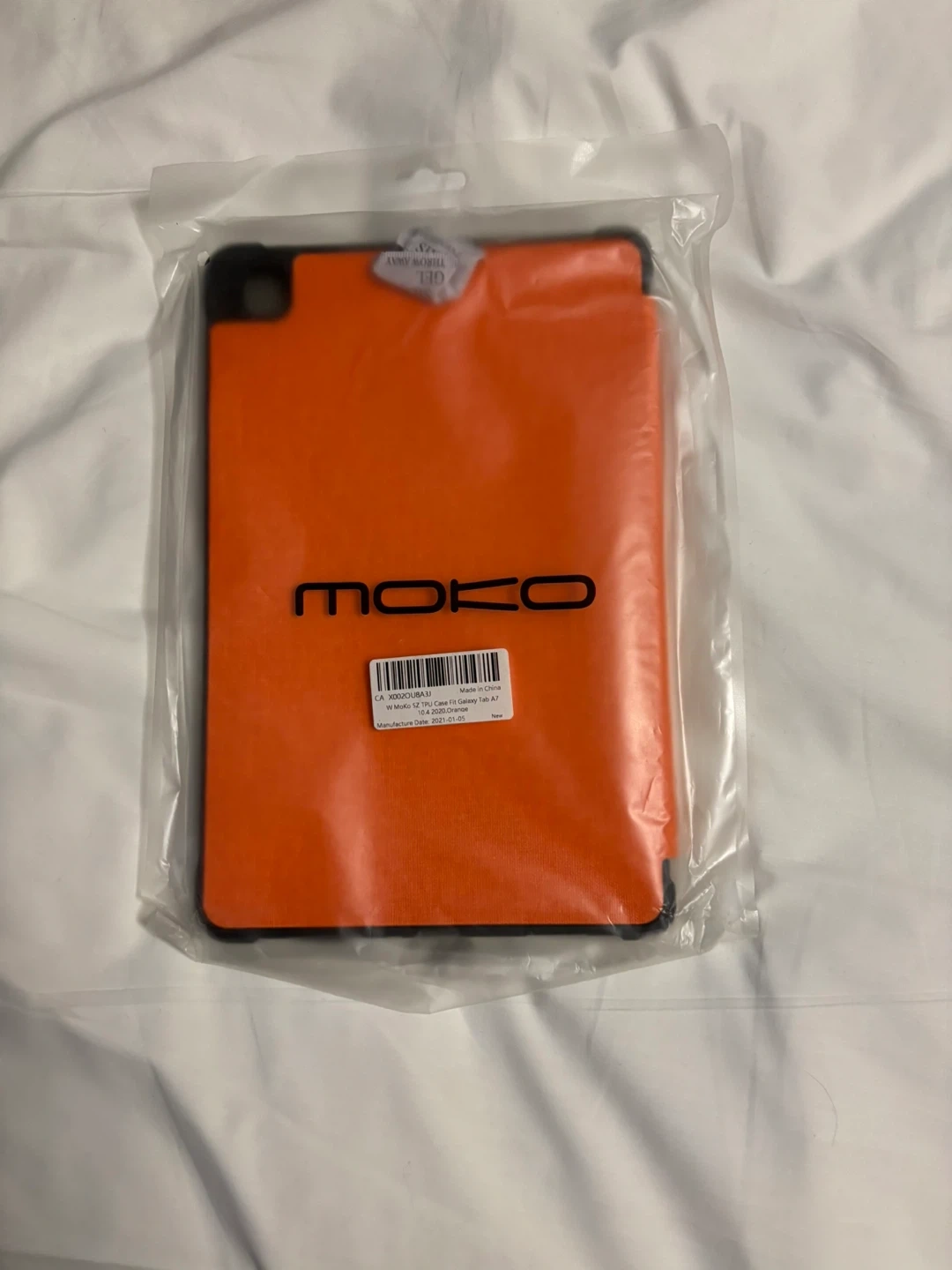 This is a Moko brand TPU case designed for the Samsung Galaxy Tab A7 10.4 inch, model from 2020. It's orange and made of TPU material. Manufactured January 5th, 2021. This case protects your tablet!