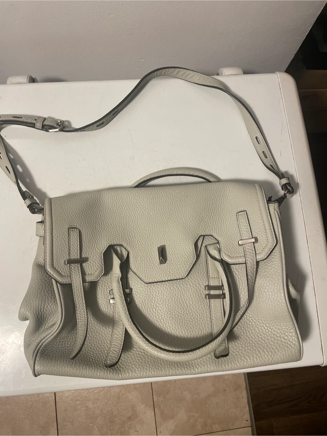 This is an authentic Rebecca Minkoff handbag made of high quality leather. Differences in color shading, scratch/marks and grain are the inherent characteristics of the lush, natural leathers chosen to create the Rebecca Minkoff collection. Style is Jules Satchel. Color is Pale Grey.