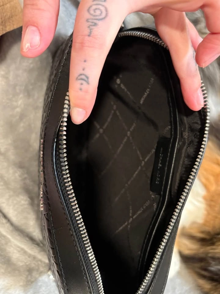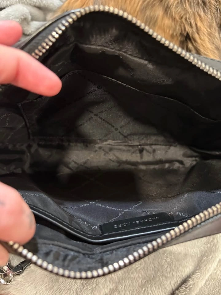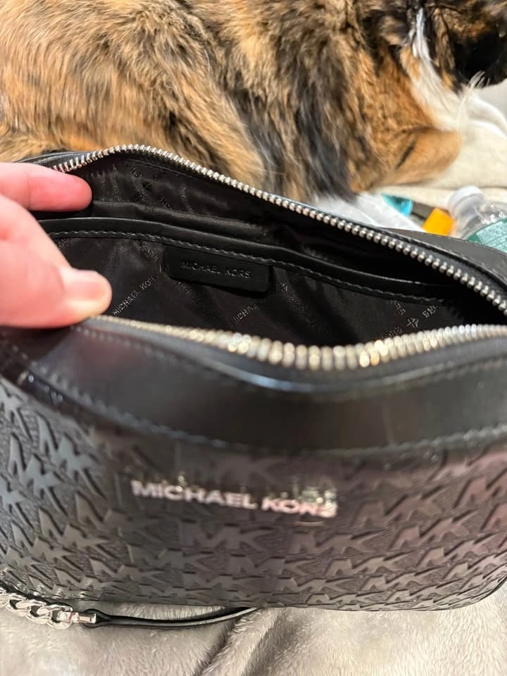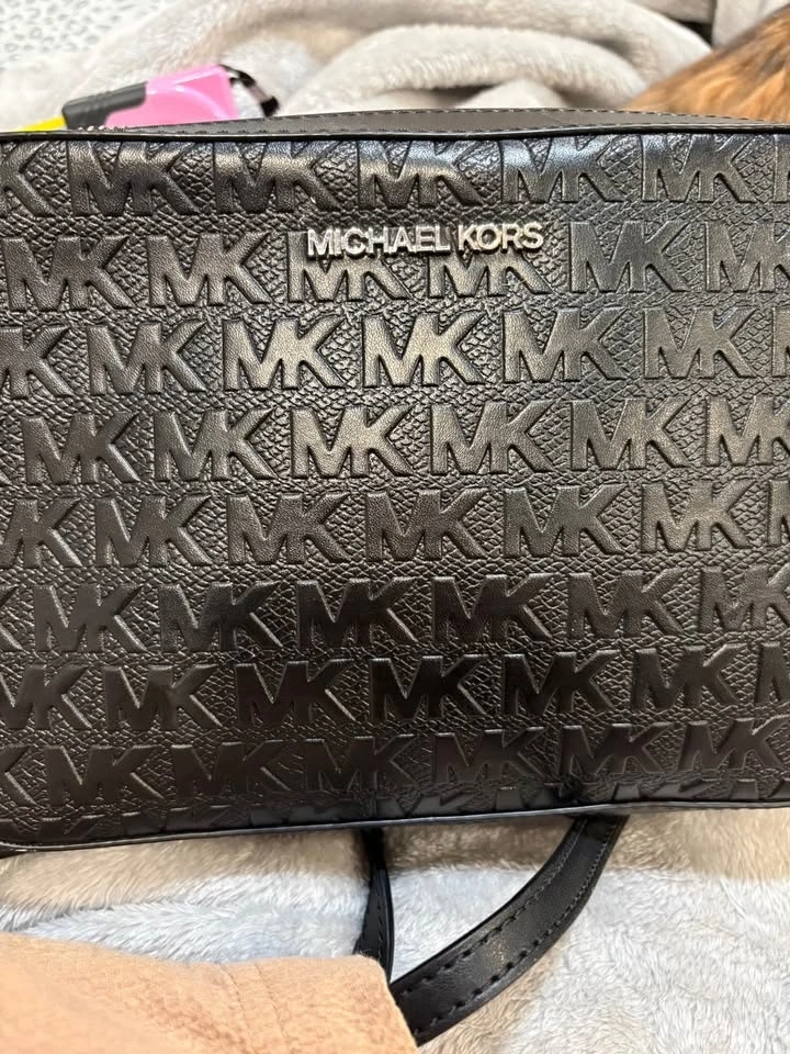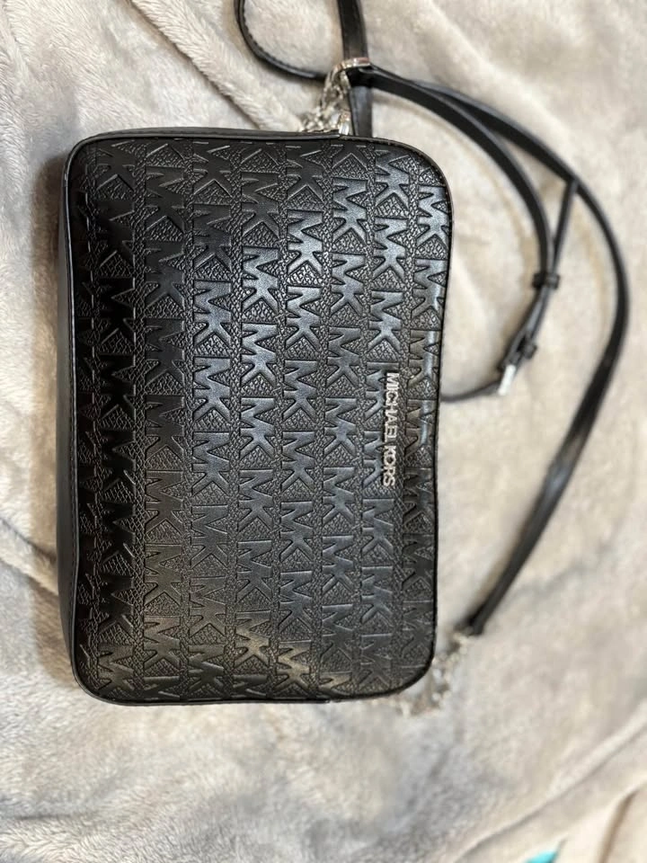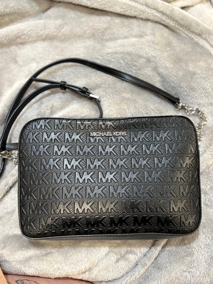 Stylish Michael Kors black crossbody bag with an all-over embossed MK monogram pattern. Features silver hardware and a zipper closure. The adjustable strap includes a bit of chain detail. The inside has a lining with the Michael Kors logo and a slip pocket.