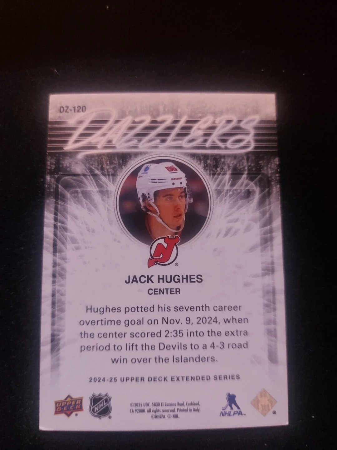 This is an Upper Deck Dazzlers card featuring Jack Hughes of the New Jersey Devils. It's from the 2024-25 Extended Series. The card highlights his seventh career overtime goal on Nov. 9, 2024.